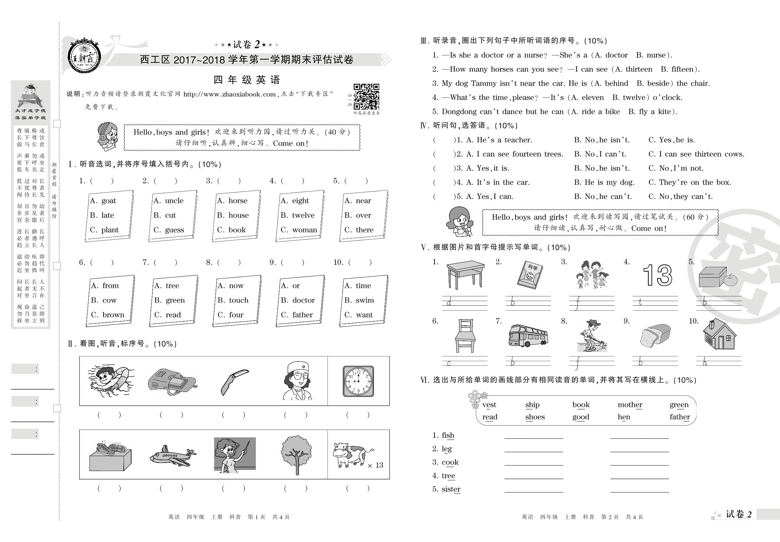 2017-2018学年第一学期洛阳市西工区四年级英语试卷(科普版)【2】