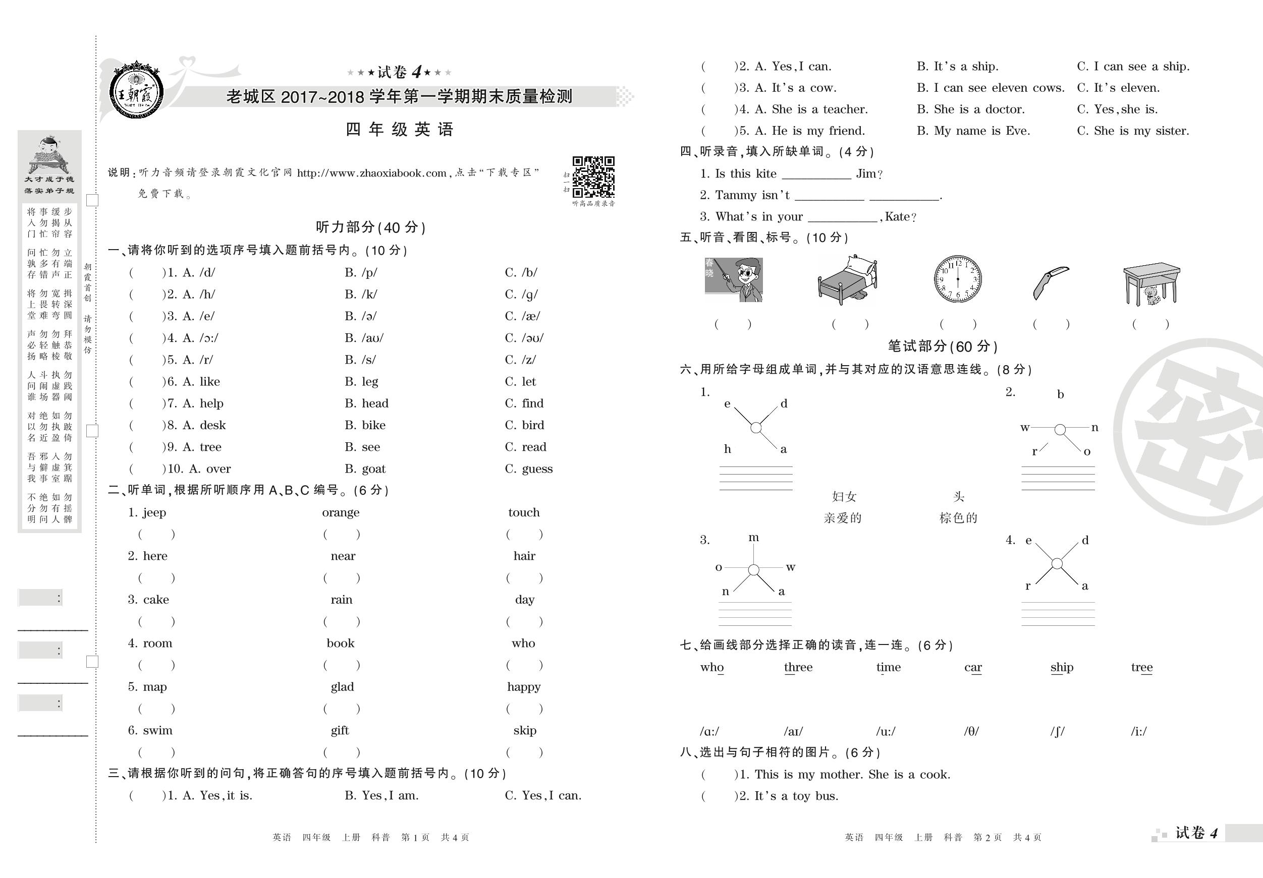 2017-2018学年第一学期洛阳市老城区四年级英语试卷(科普版)【4】