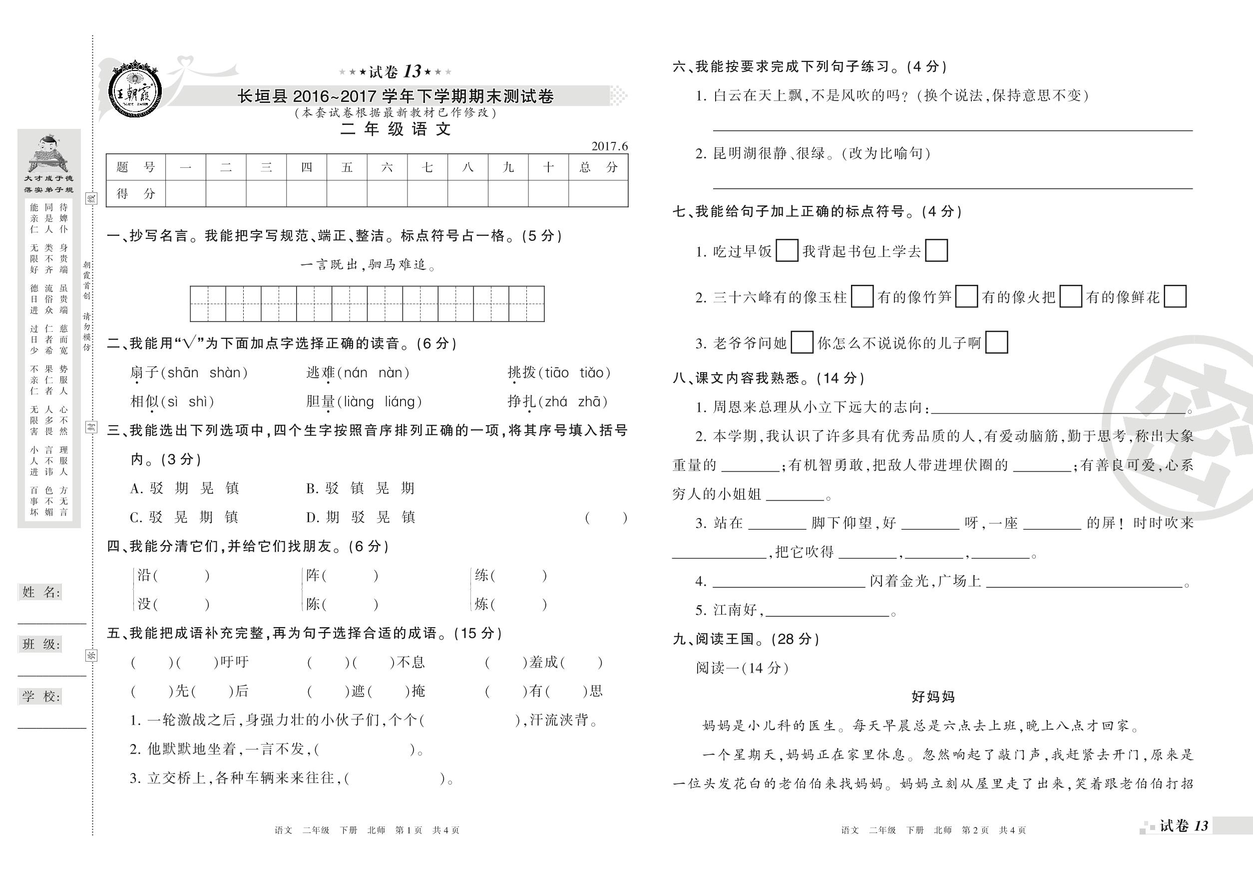 2016-2017学年第二学期新乡市长垣县二年级语文试卷(北师版)【13】