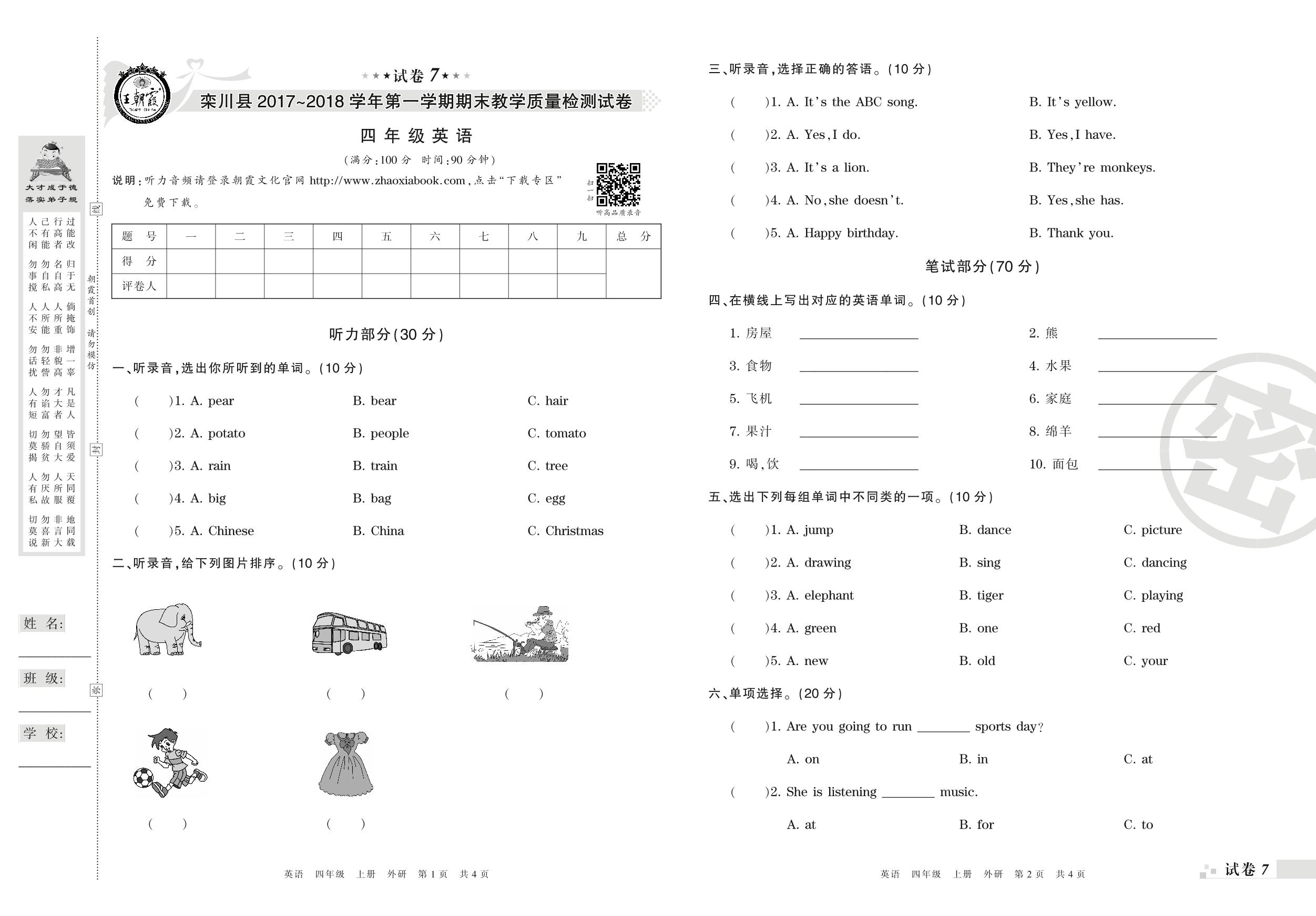 2017-2018学年第一学期洛阳市栾川县四年级英语试卷(外研版)【7】