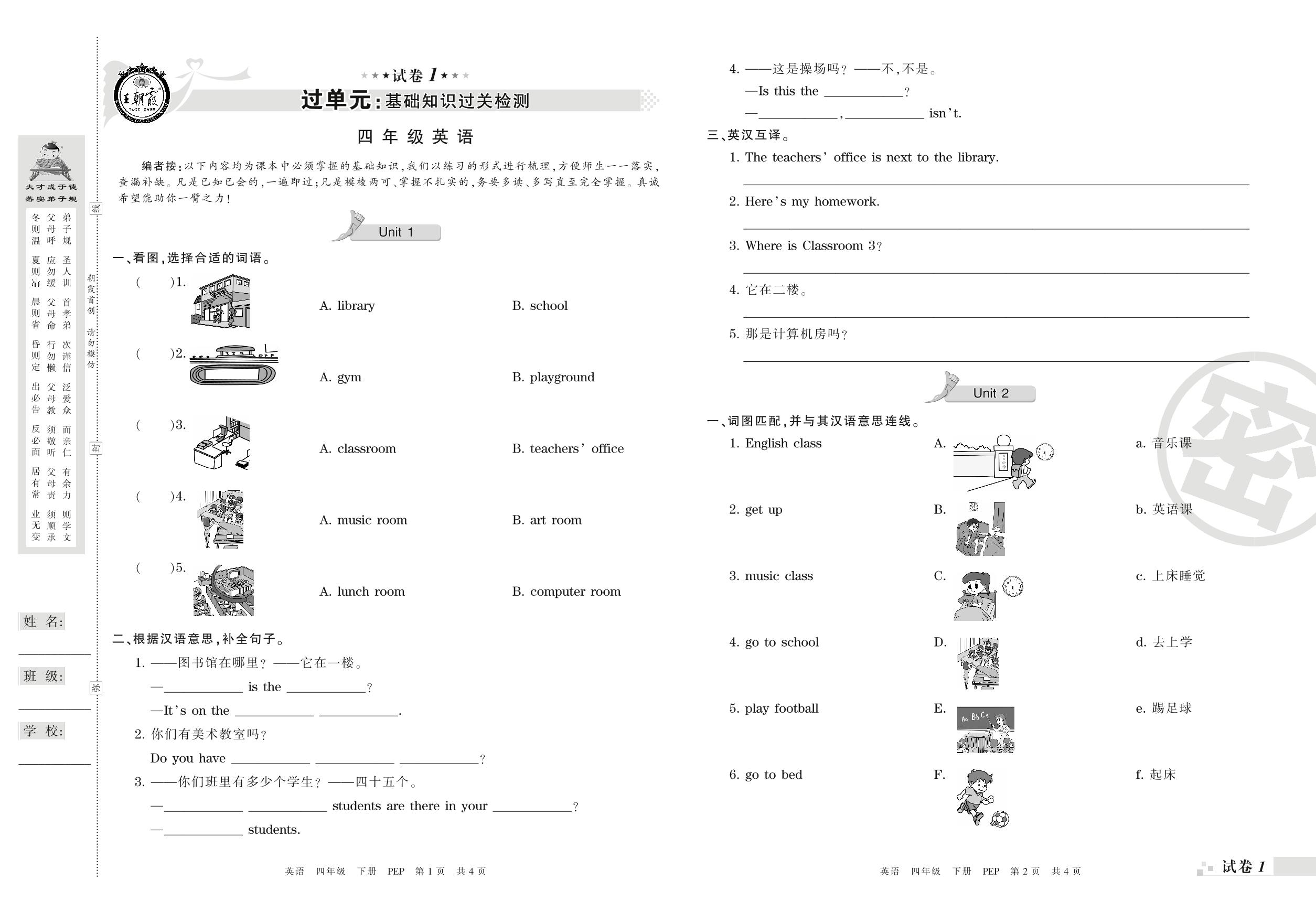 王朝霞期末过单元:基础知识过关检测四年级下册英语(PEP版)【1】