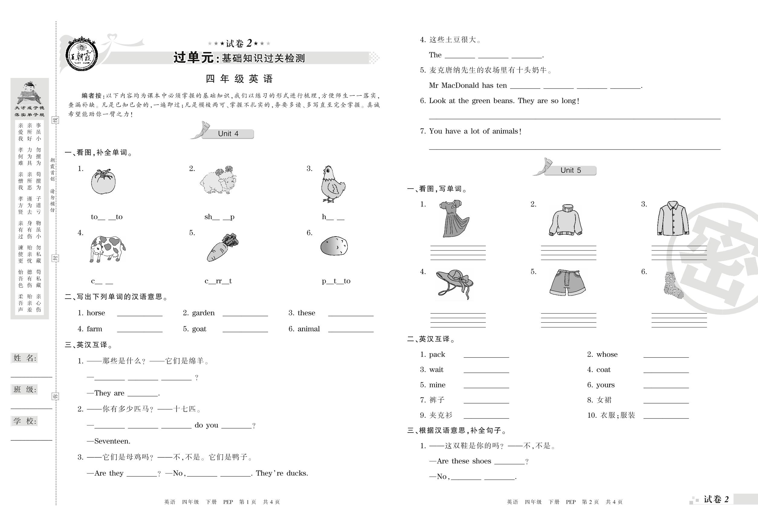 四年级英语人教PEP版(三起始)下册单元卷