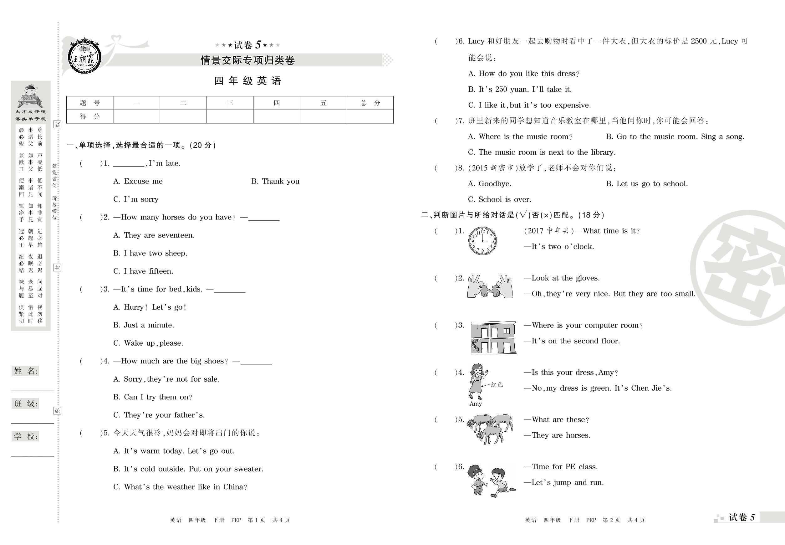 王朝霞期末专项卷——情景交际专项归类卷四年级下册英语(PEP版)【5】