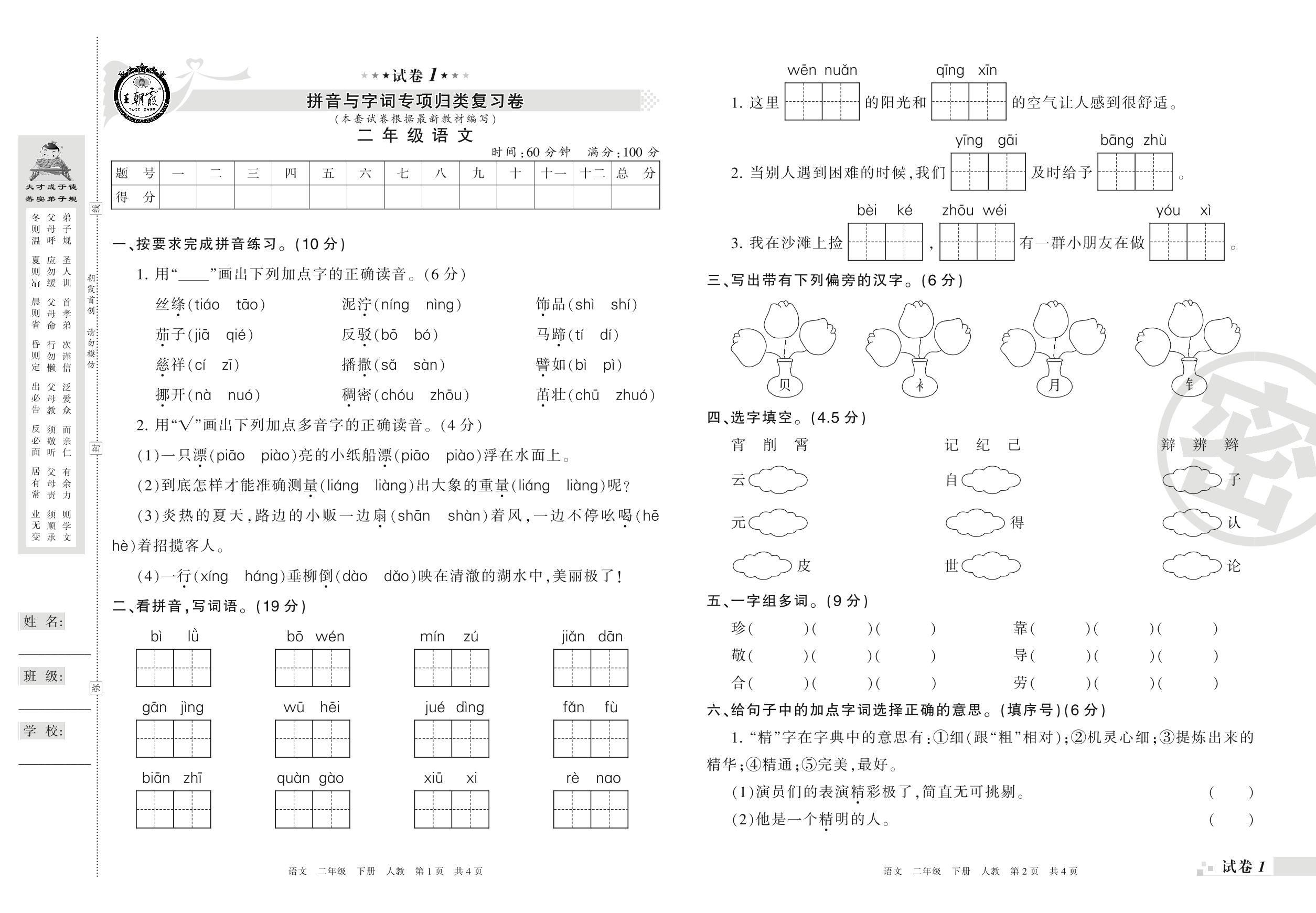 王朝霞期末专项卷——拼音与字词专项归类复习卷二年级下册语文(人教版)_R21080181652【1】
