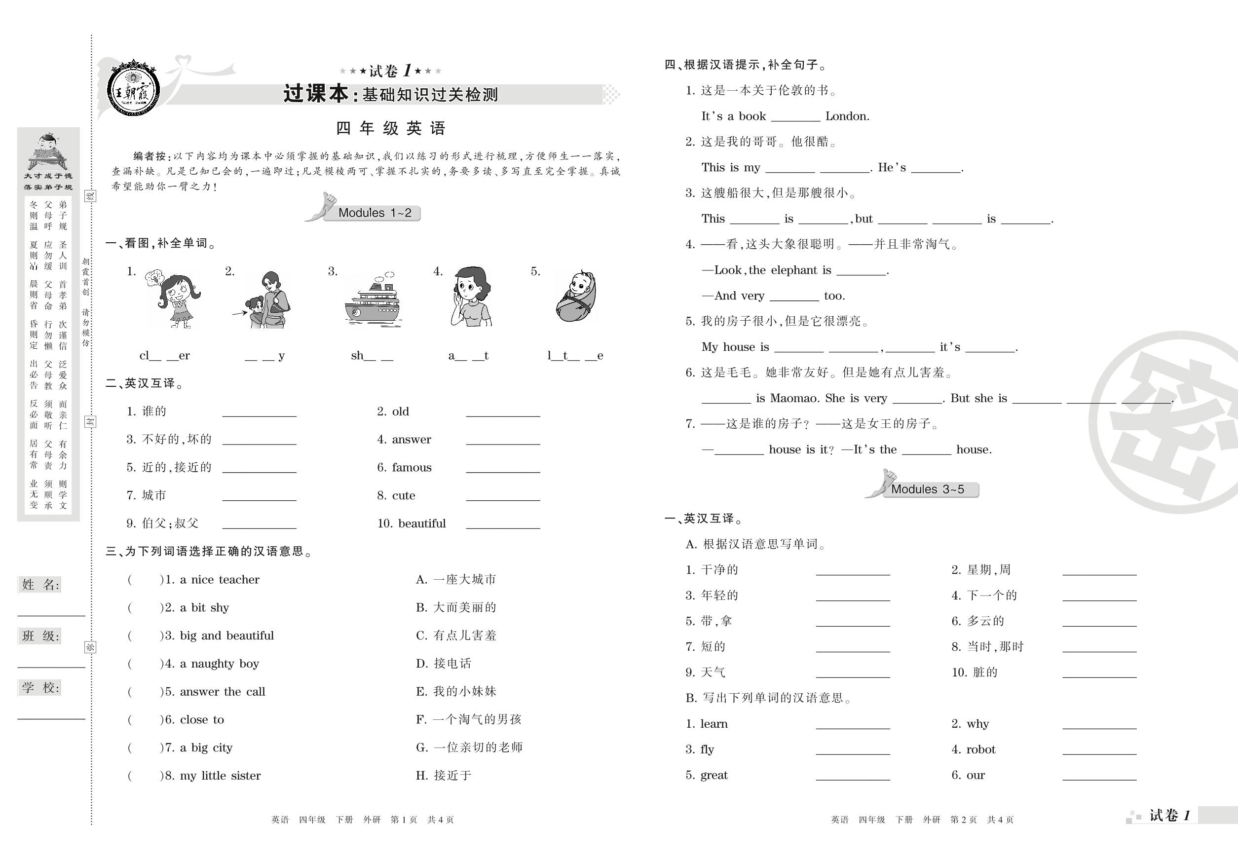 王朝霞期末过课本:基础知识过关检测四年级下册英语(外研版)【1】