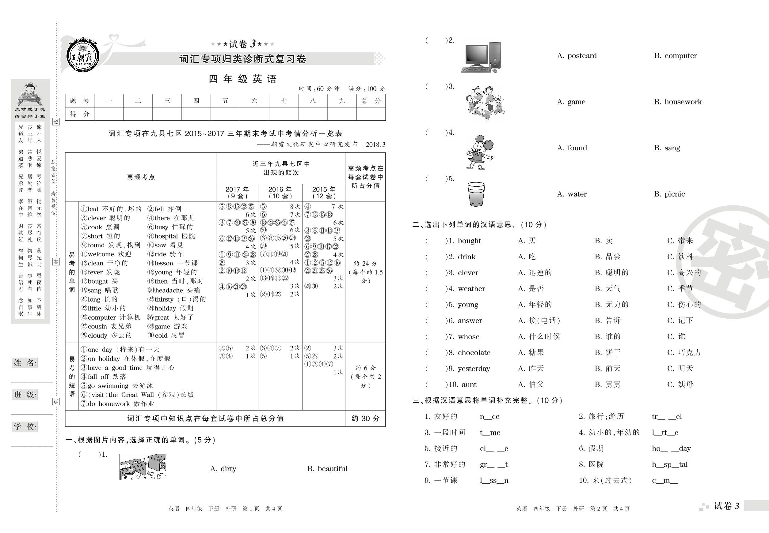 王朝霞期末专项卷——词汇专项归类诊断式复习卷四年级下册英语(外研版)【3】