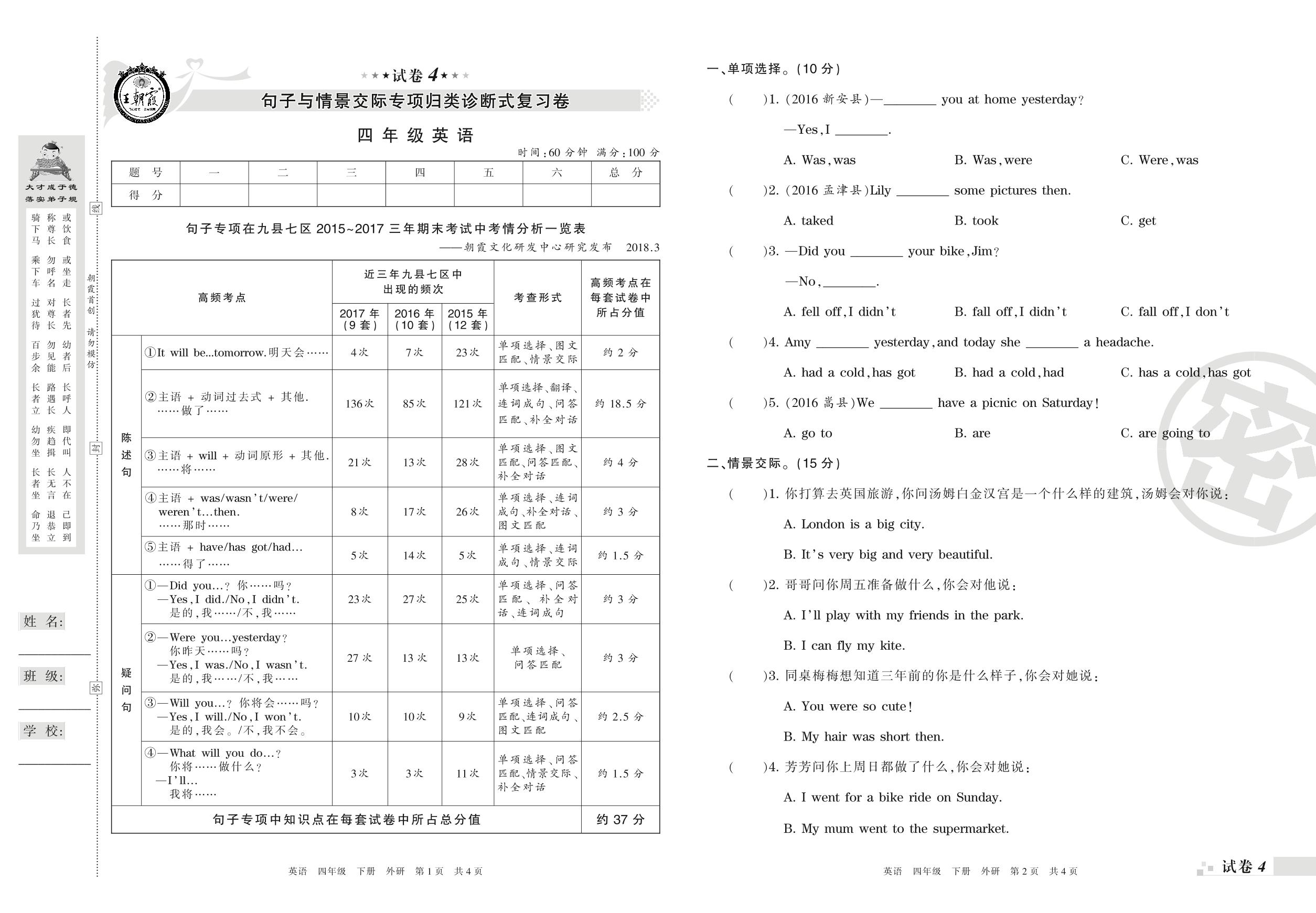 王朝霞期末专项卷——句子与情景交际专项归类诊断式复习卷四年级下册英语(外研版)【4】
