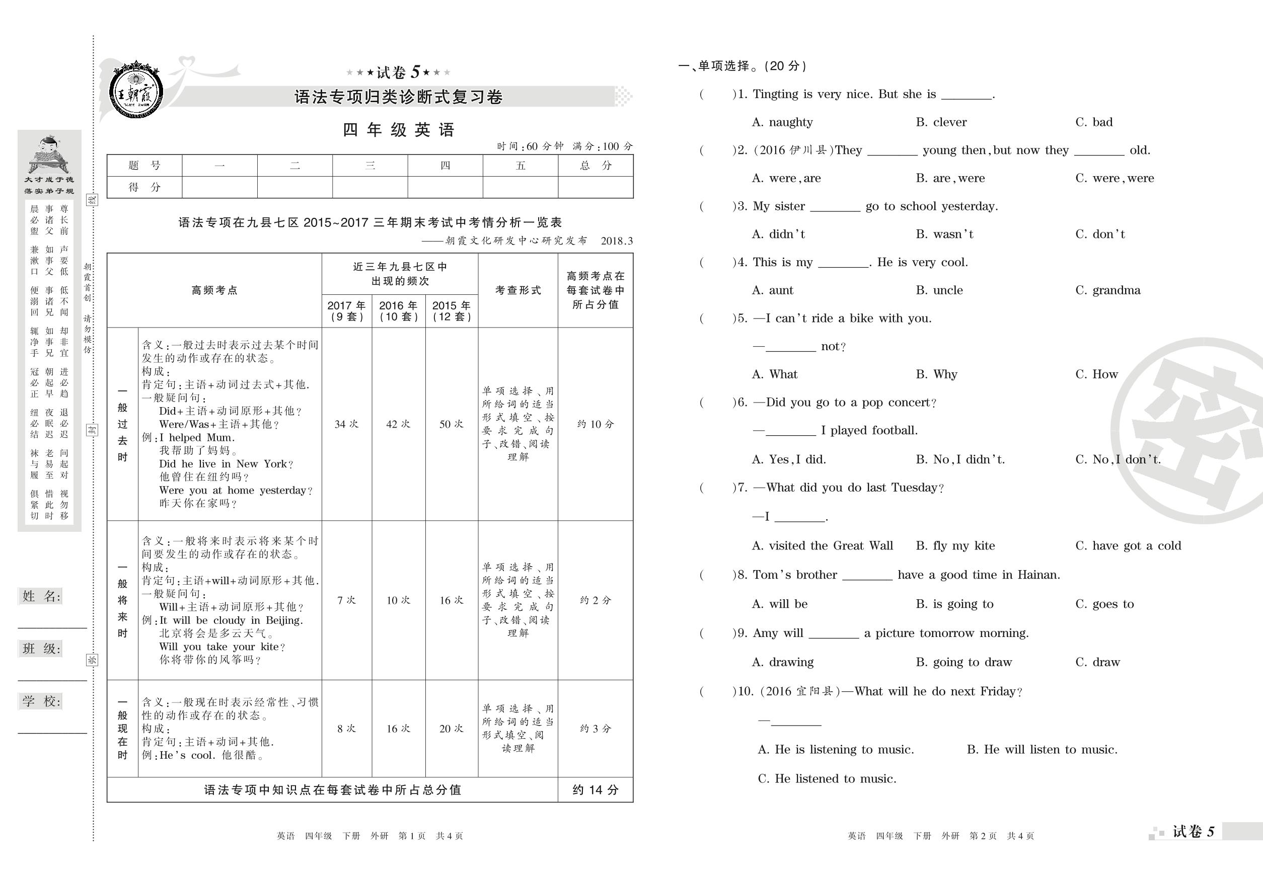 王朝霞期末专项卷——语法专项归类诊断式复习卷四年级下册英语(外研版)【5】