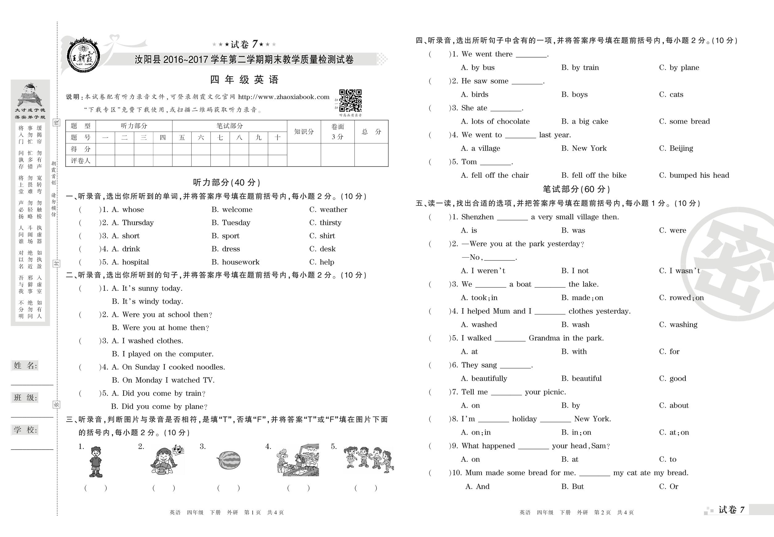2016-2017学年第二学期洛阳市汝阳县四年级英语试卷(外研版)【7】