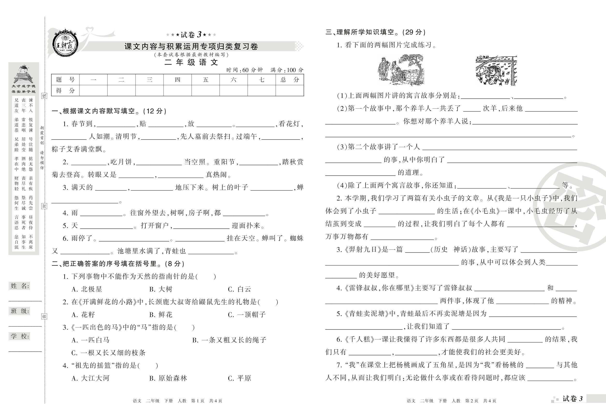 王朝霞期末专项卷——课文内容与积累运用专项归类复习卷二年级下册语文(人教版)_R21080181658【3】