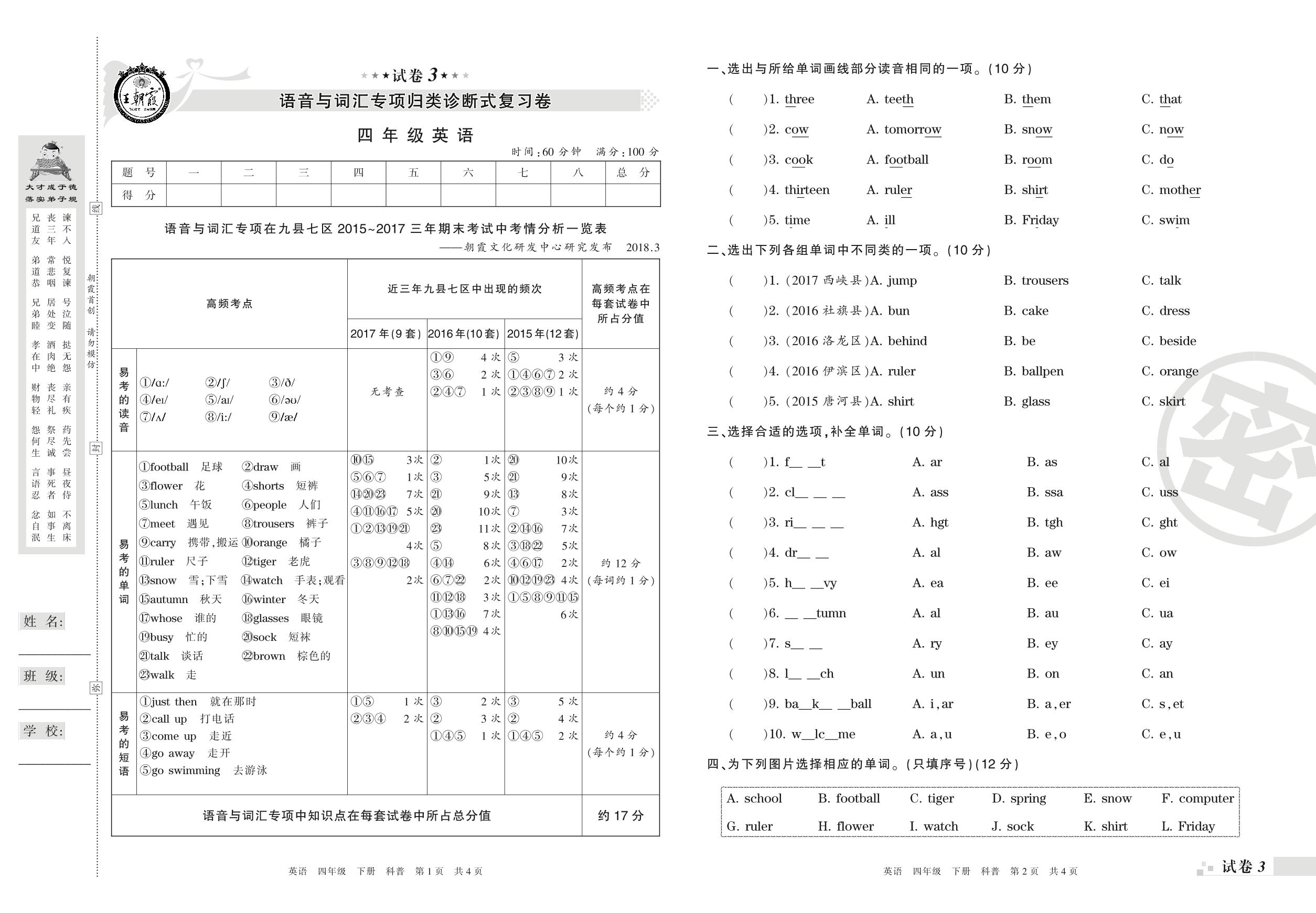 王朝霞期末专项卷——语音与词汇专项归类诊断式复习卷四年级下册英语(科普版)【3】