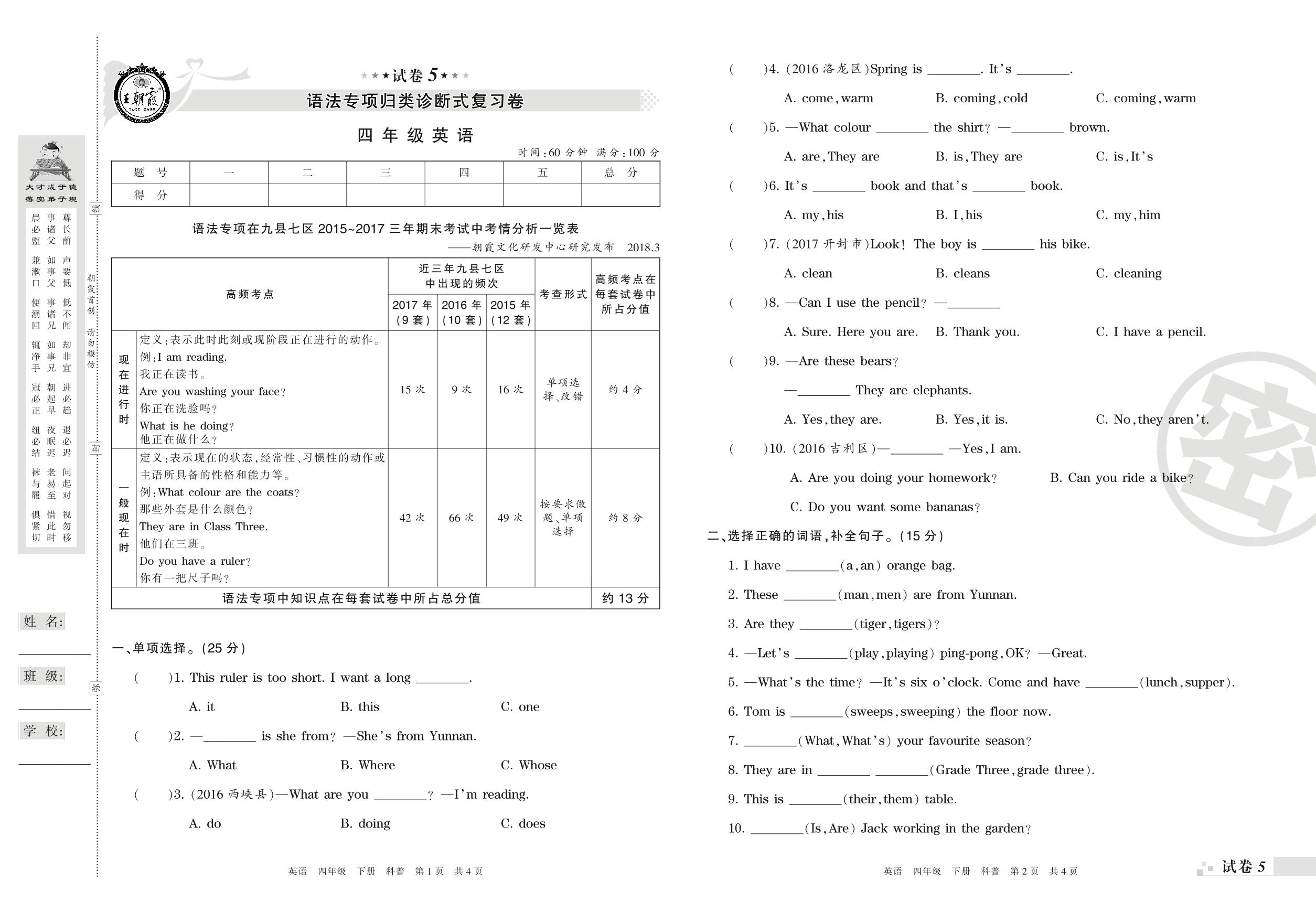 王朝霞期末专项卷——语法专项归类诊断式复习卷四年级下册英语(科普版)【5】