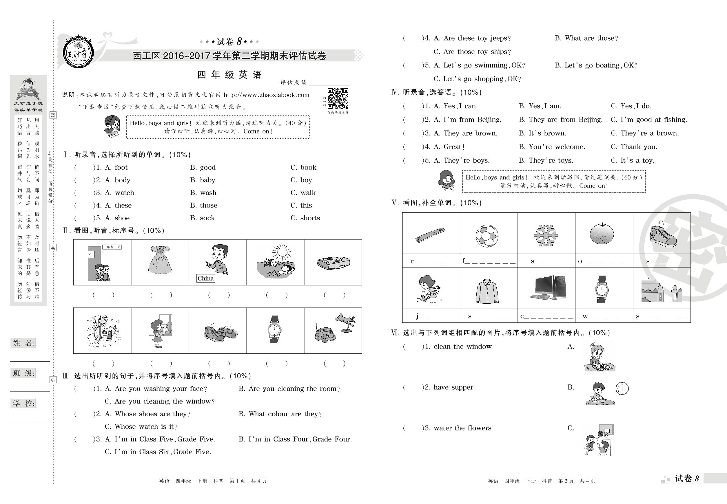 2016-2017学年第二学期洛阳市西工区四年级英语试卷(科普版)【8】
