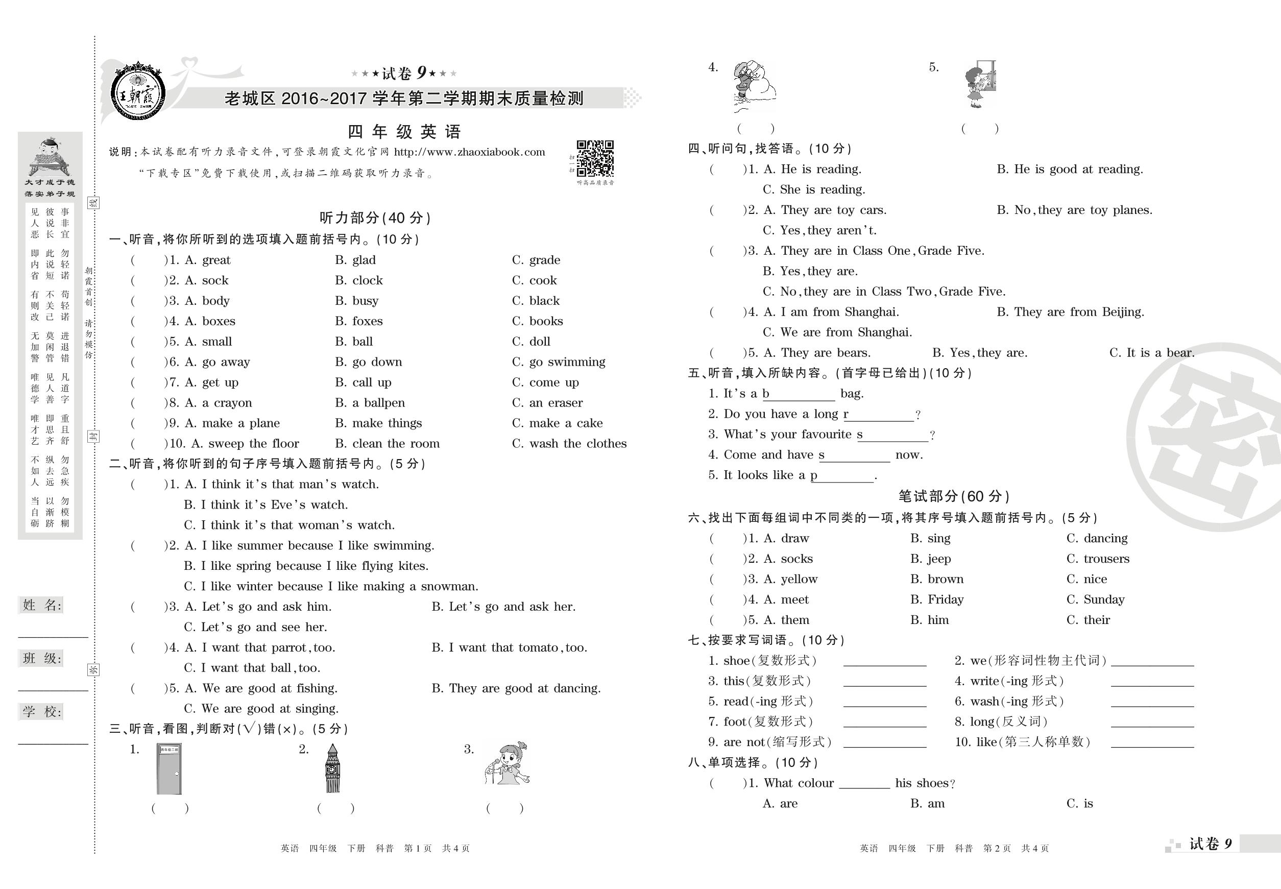 2016-2017学年第二学期洛阳市老城区四年级英语试卷(科普版)【9】