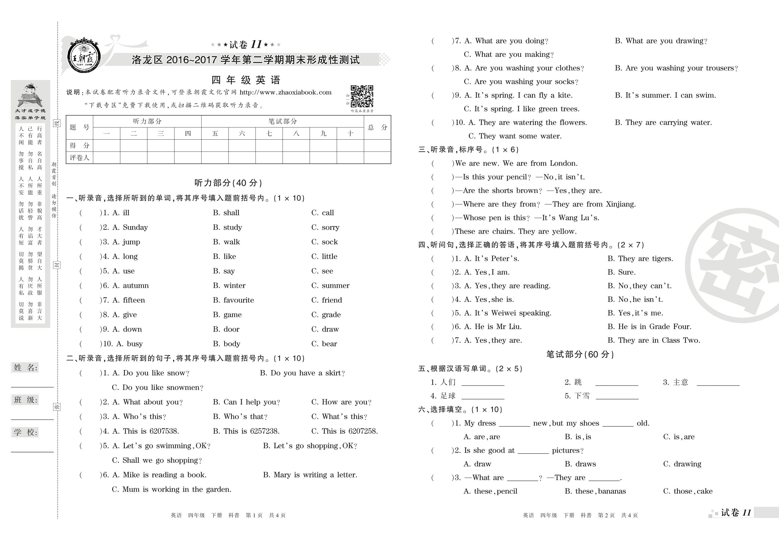2016-2017学年第二学期洛阳市洛龙区四年级英语试卷(科普版)【11】