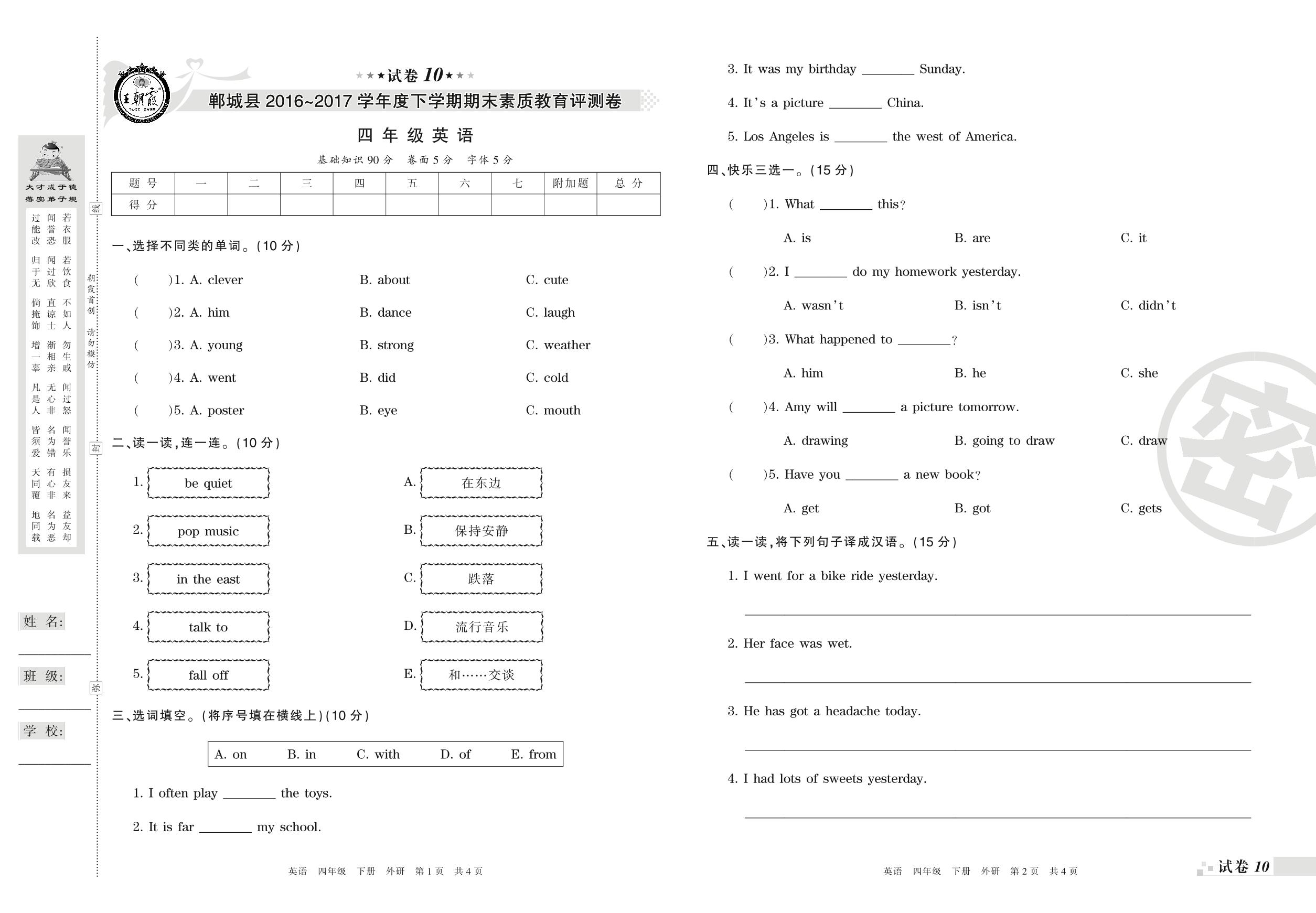 2016-2017学年第二学期周口市郸城县四年级英语试卷(外研版)【10】