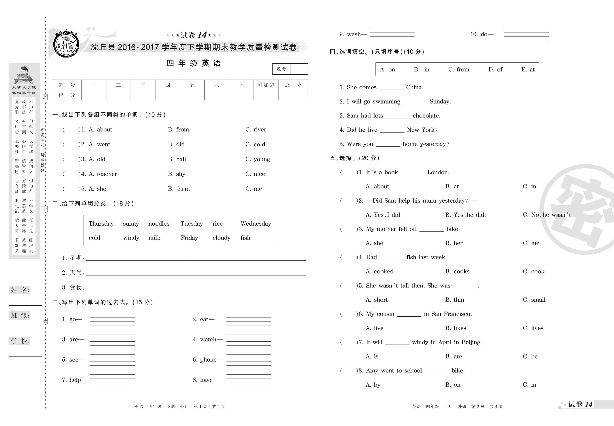 四年级英语外研版(三起始)下册期末卷