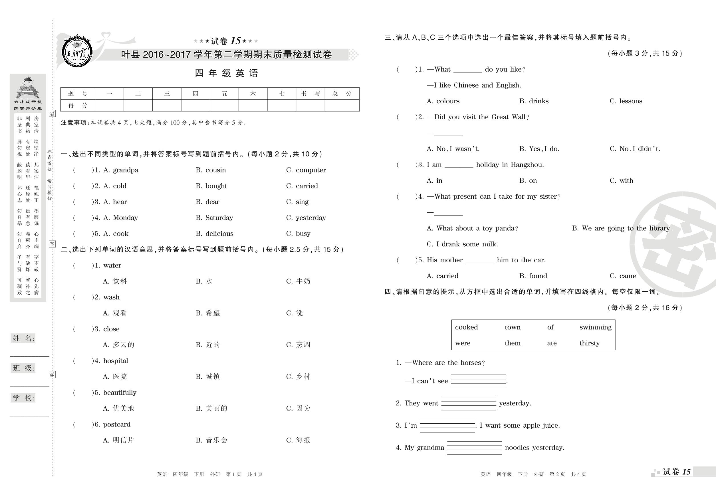 2016-2017学年第二学期平顶山市叶县四年级英语试卷(外研版)【15】