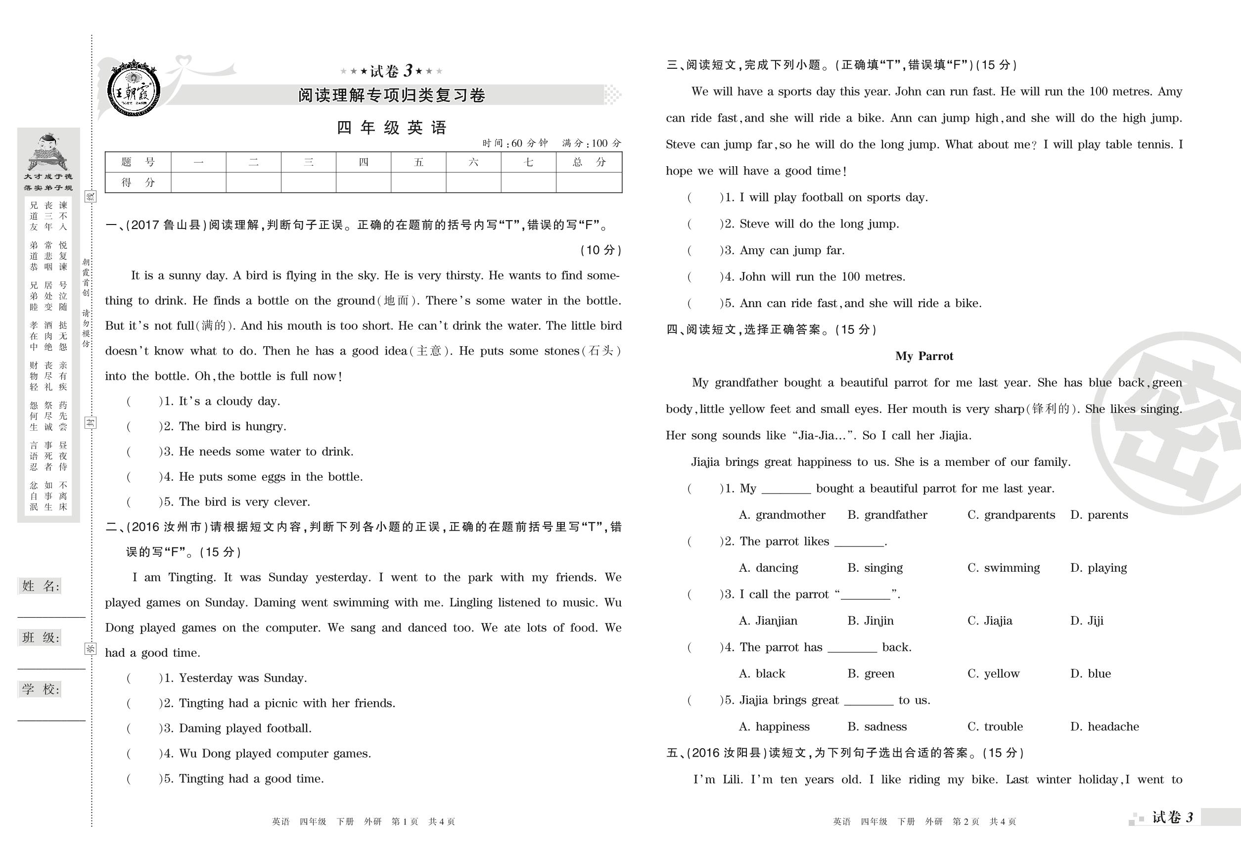 王朝霞期末专项卷——阅读理解专项归类复习卷四年级下册英语(外研版)【3】