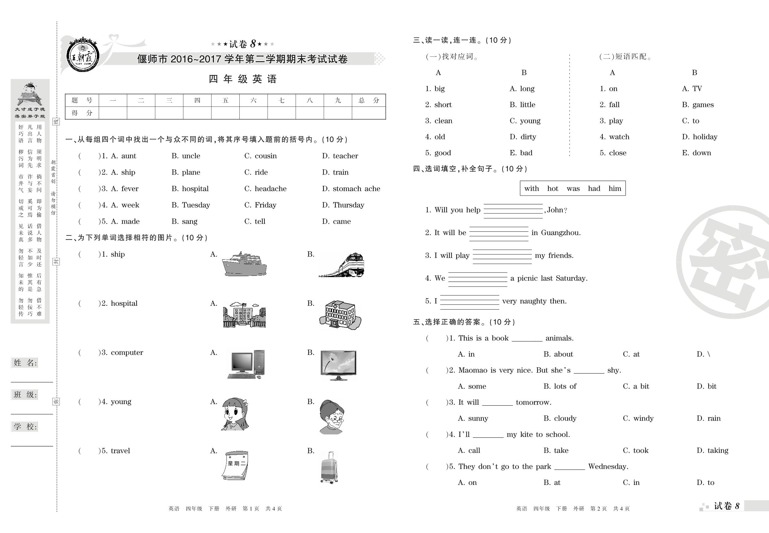 2016-2017学年第二学期偃师市四年级英语试卷(外研版)【8】