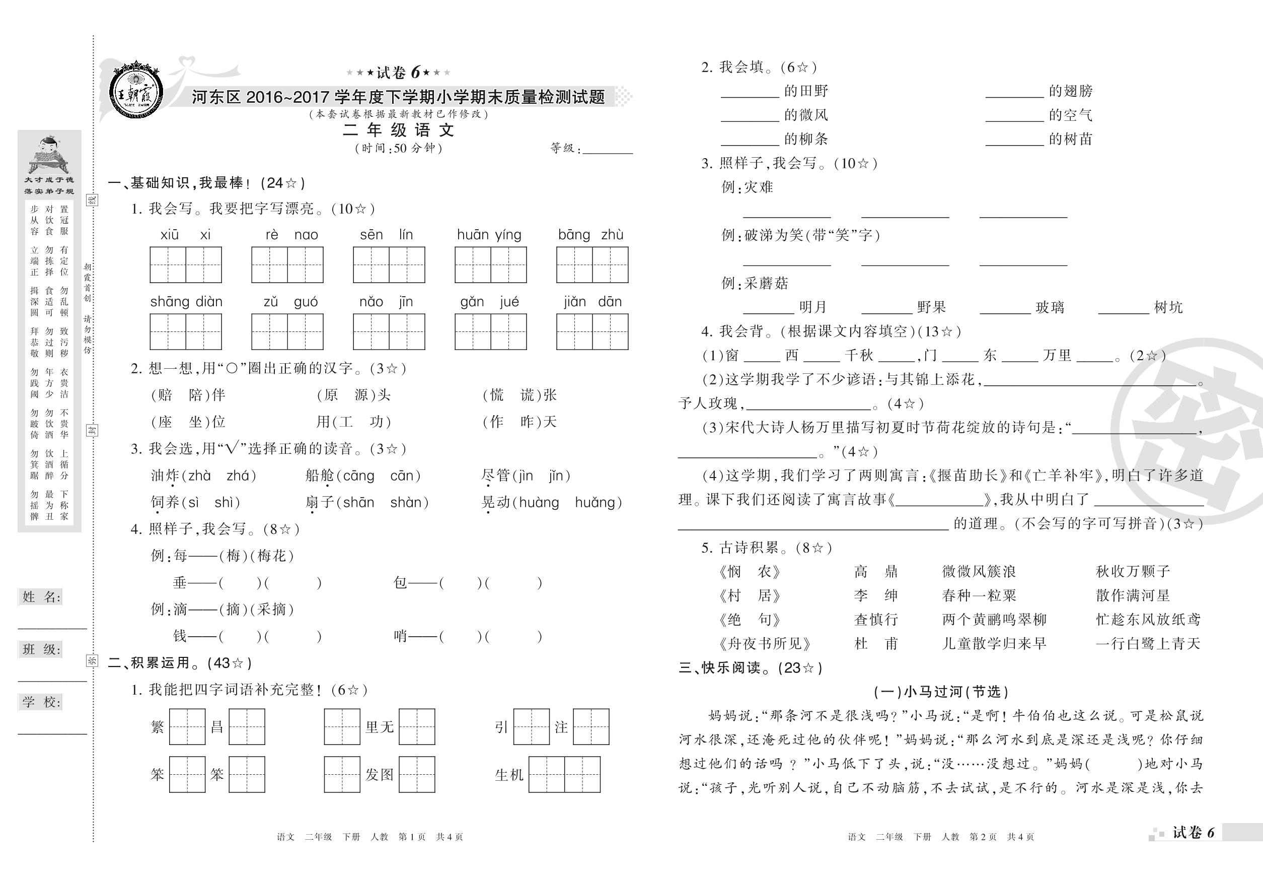 2016-2017学年第二学期临沂市河东区二年级语文试卷(人教版)【6】