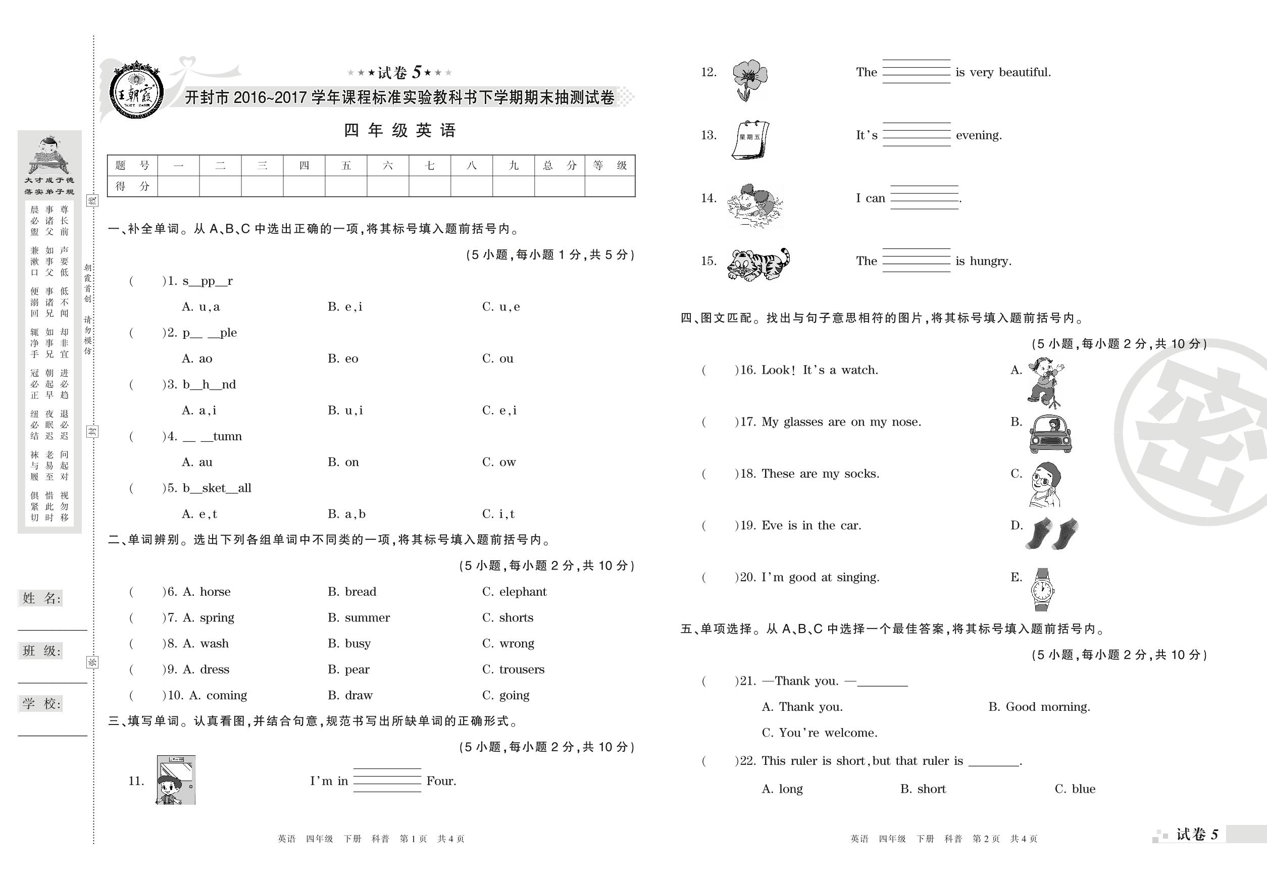 2016-2017学年第二学期开封市四年级英语试卷(科普版)【5】