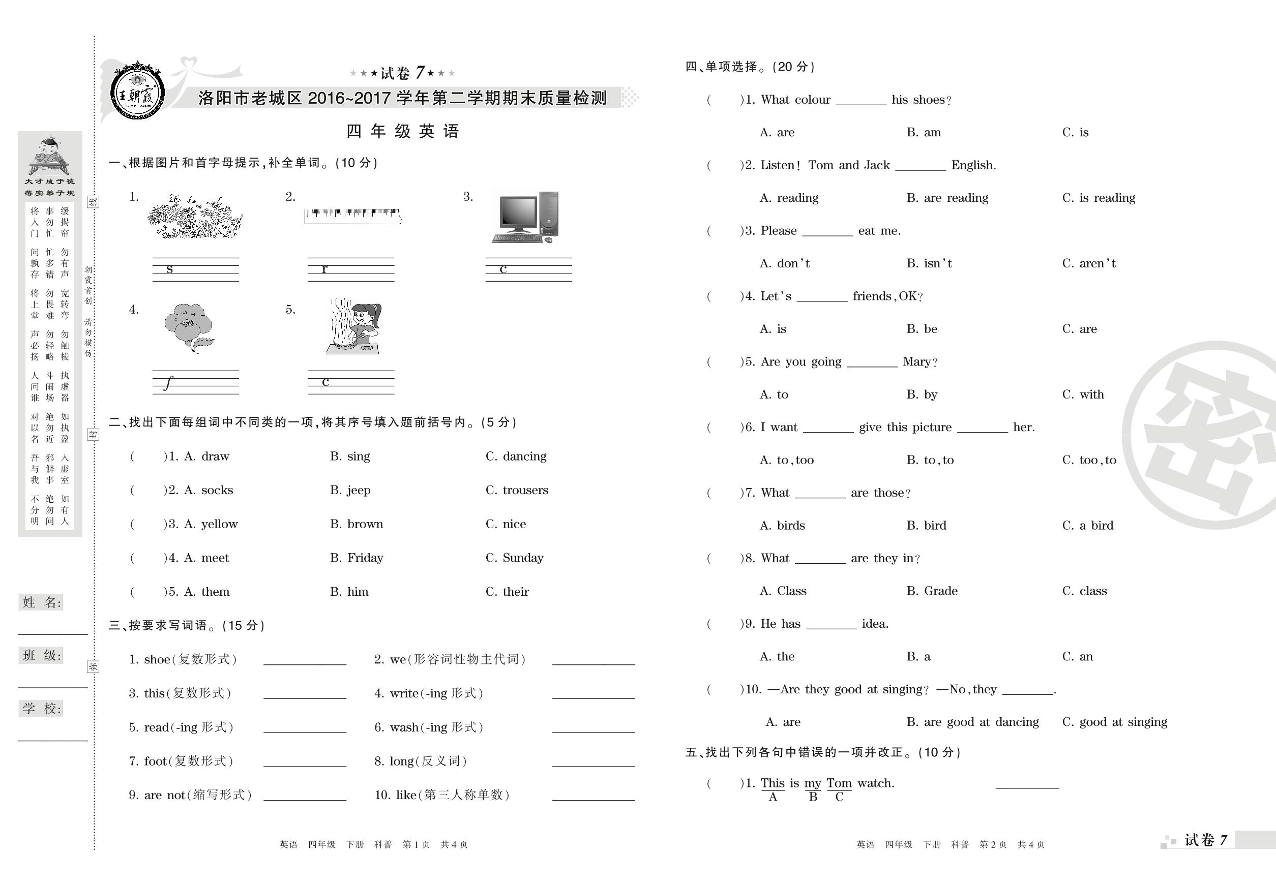 2016-2017学年第二学期洛阳市老城区四年级英语试卷(科普版)【7】