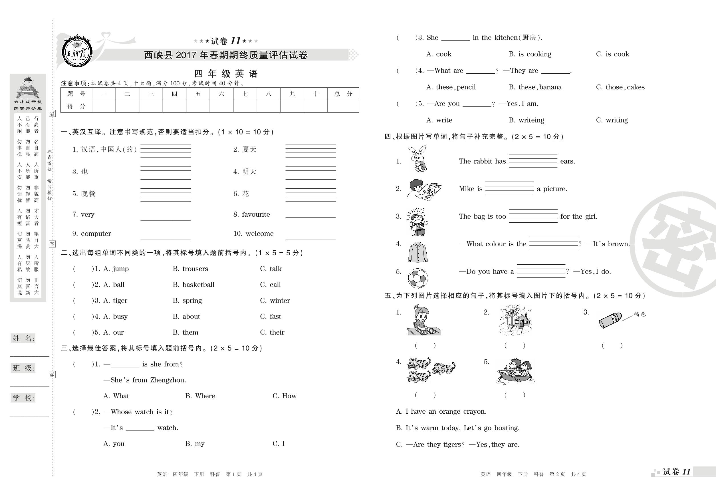 2016-2017学年第二学期南阳市西峡县四年级英语试卷(科普版)【11】