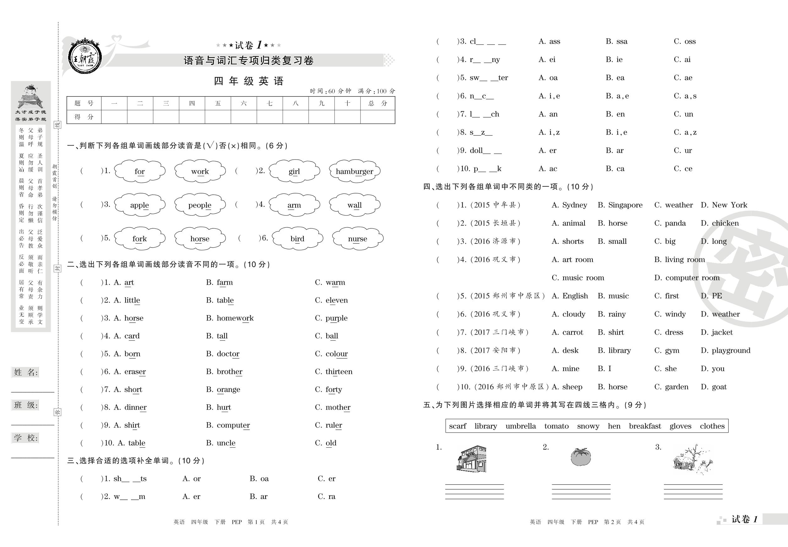 王朝霞期末专项卷——语音与词汇专项归类复习卷四年级下册英语(PEP版)【1】