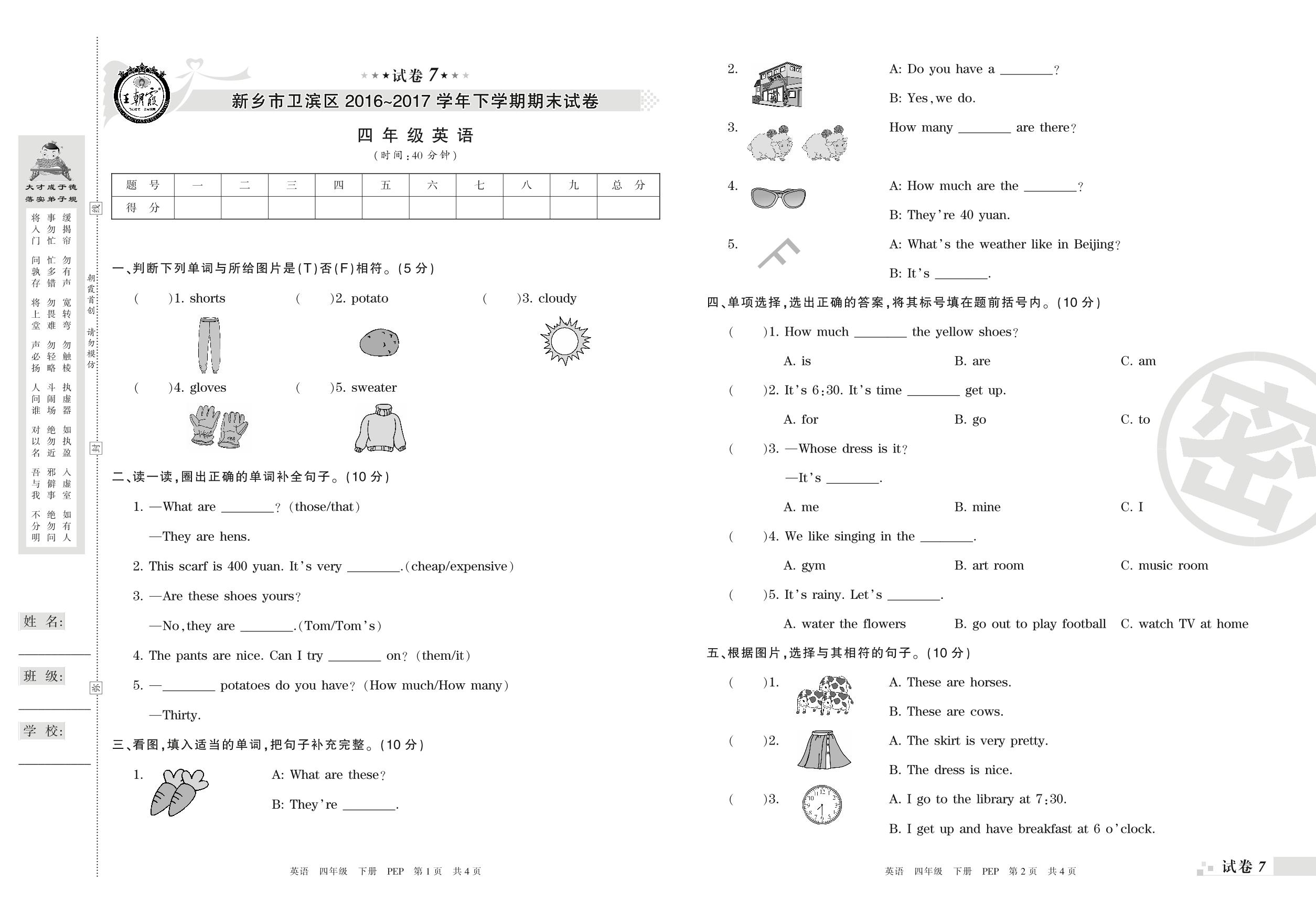 2016-2017学年第二学期新乡市卫滨区四年级英语试卷(PEP版)【7】
