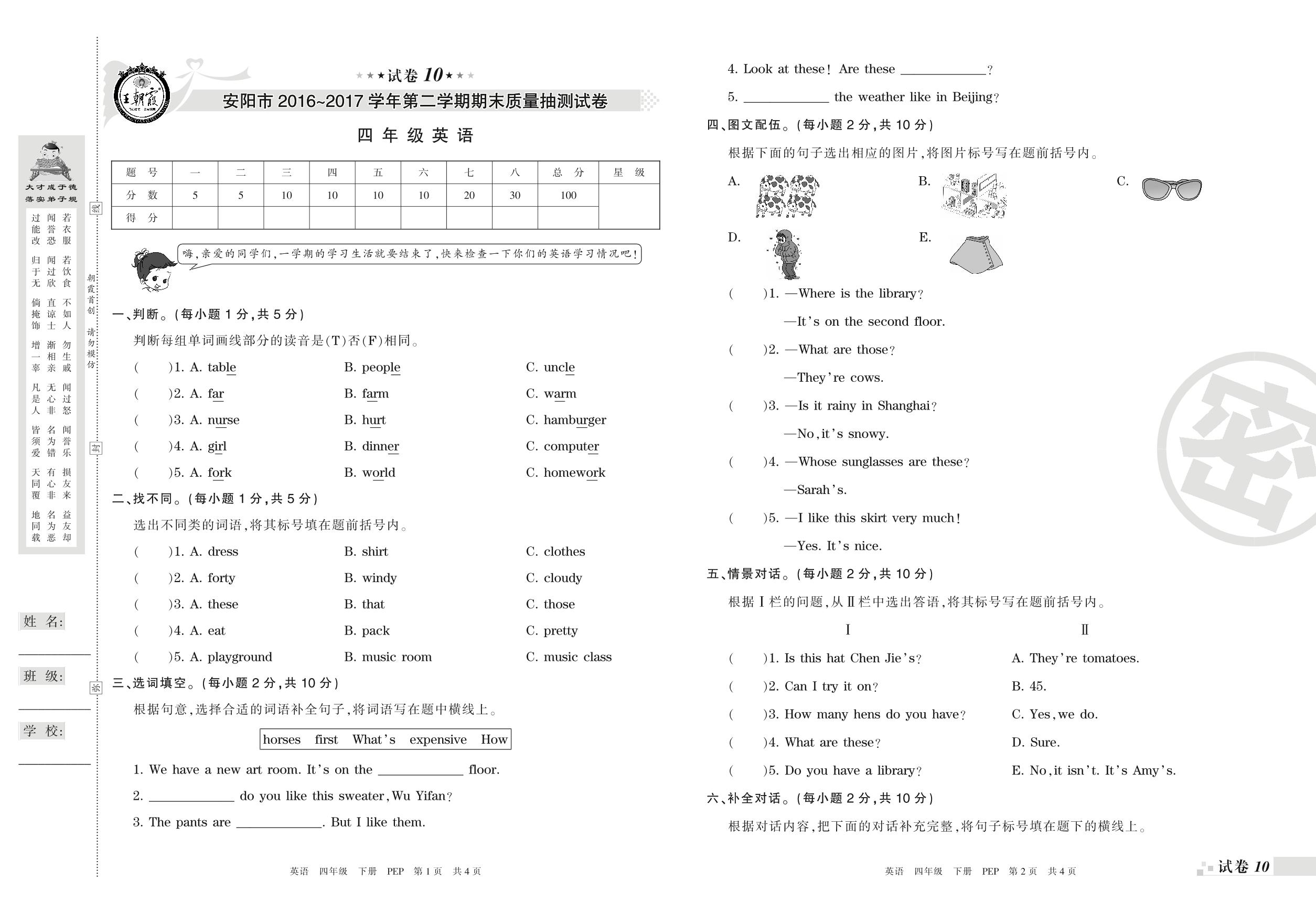 2016-2017学年第二学期安阳市四年级英语试卷(PEP版)【10】