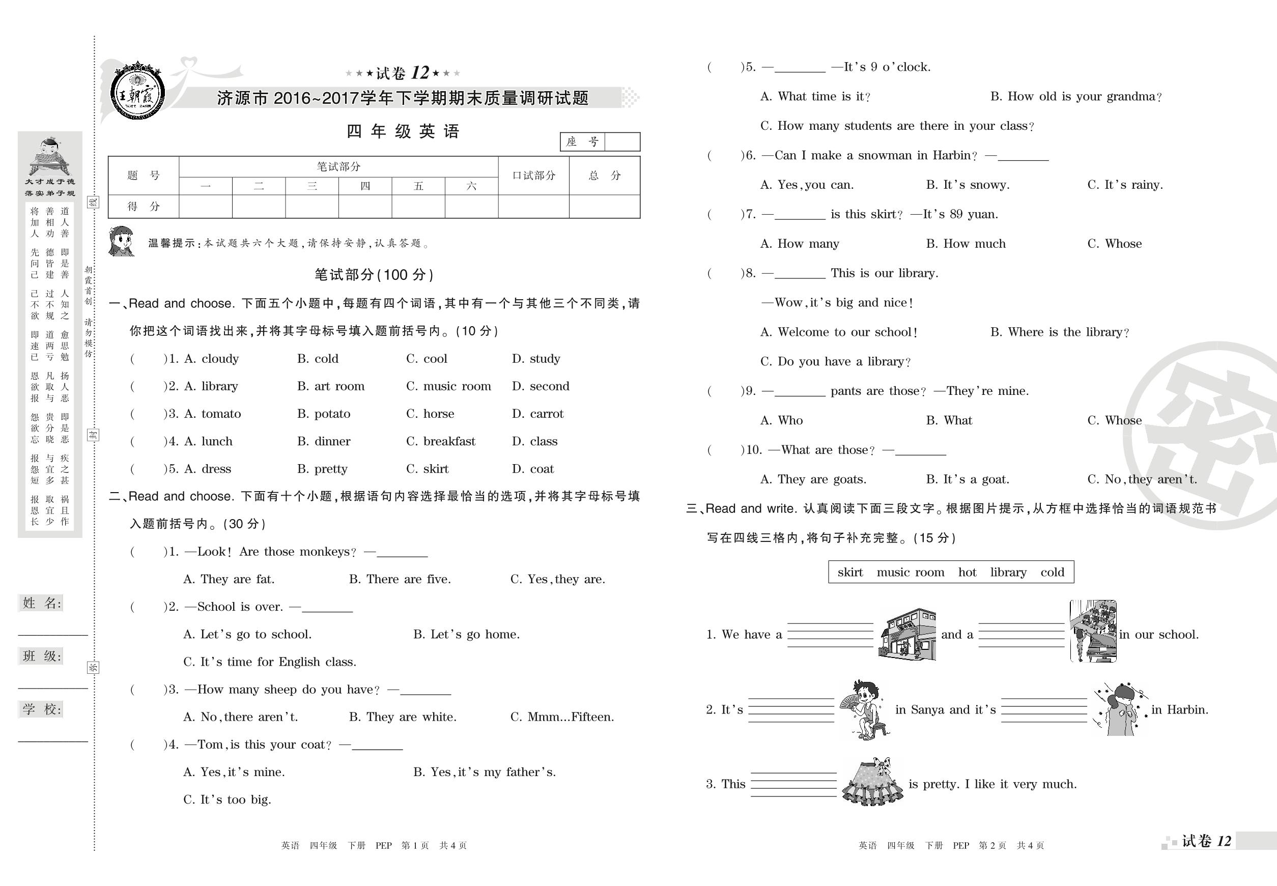 2016-2017学年第二学期济源市四年级英语试卷(PEP版)【12】