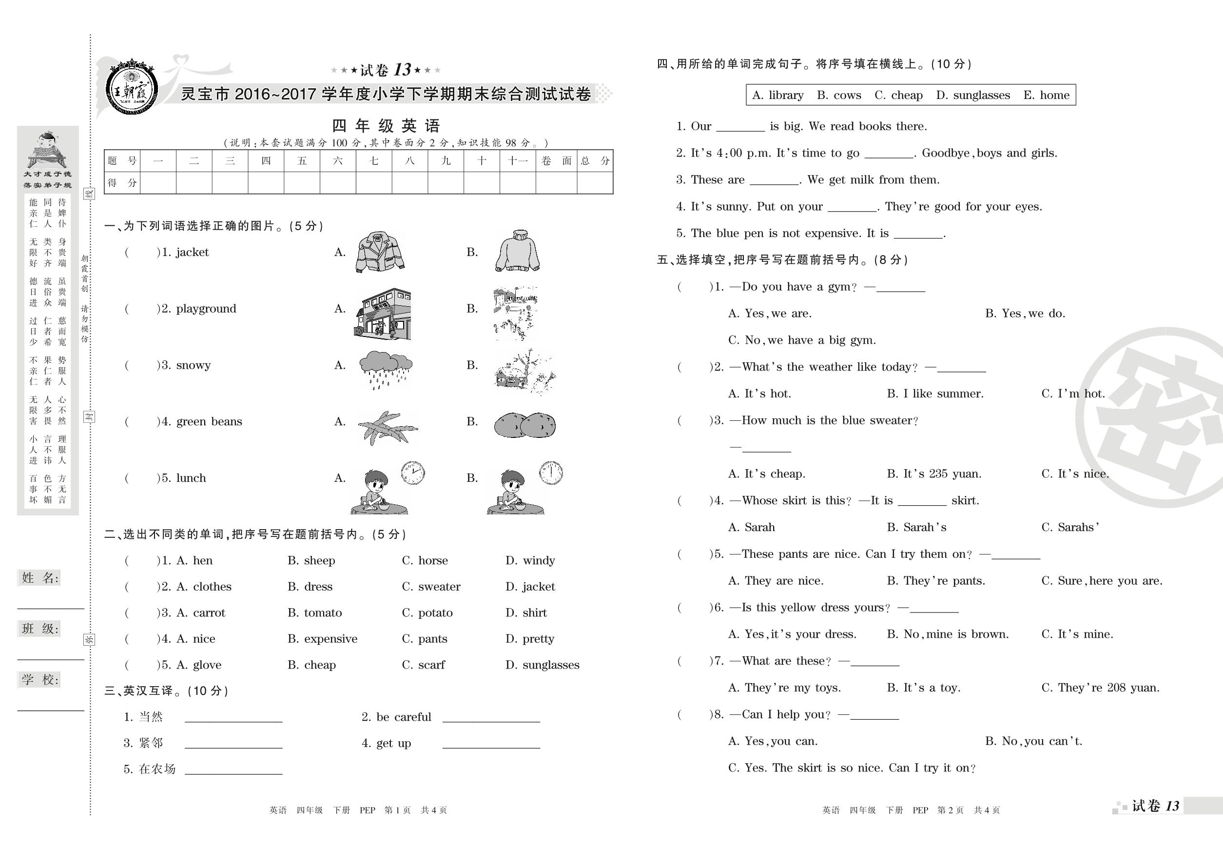 2016-2017学年第二学期灵宝市四年级英语试卷(PEP版)【13】