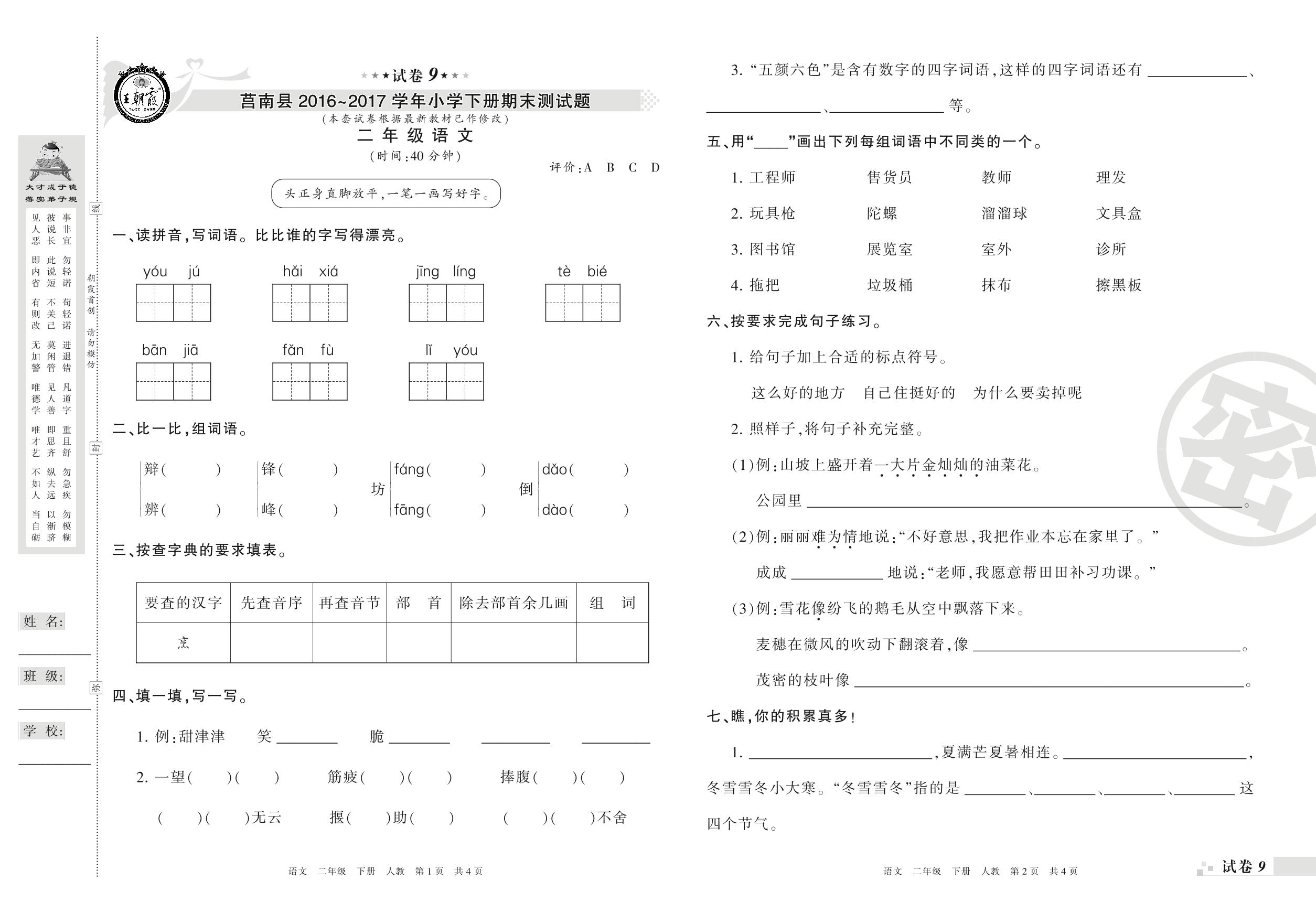 2016-2017学年第二学期临沂市莒南县二年级语文试卷(人教版)【9】