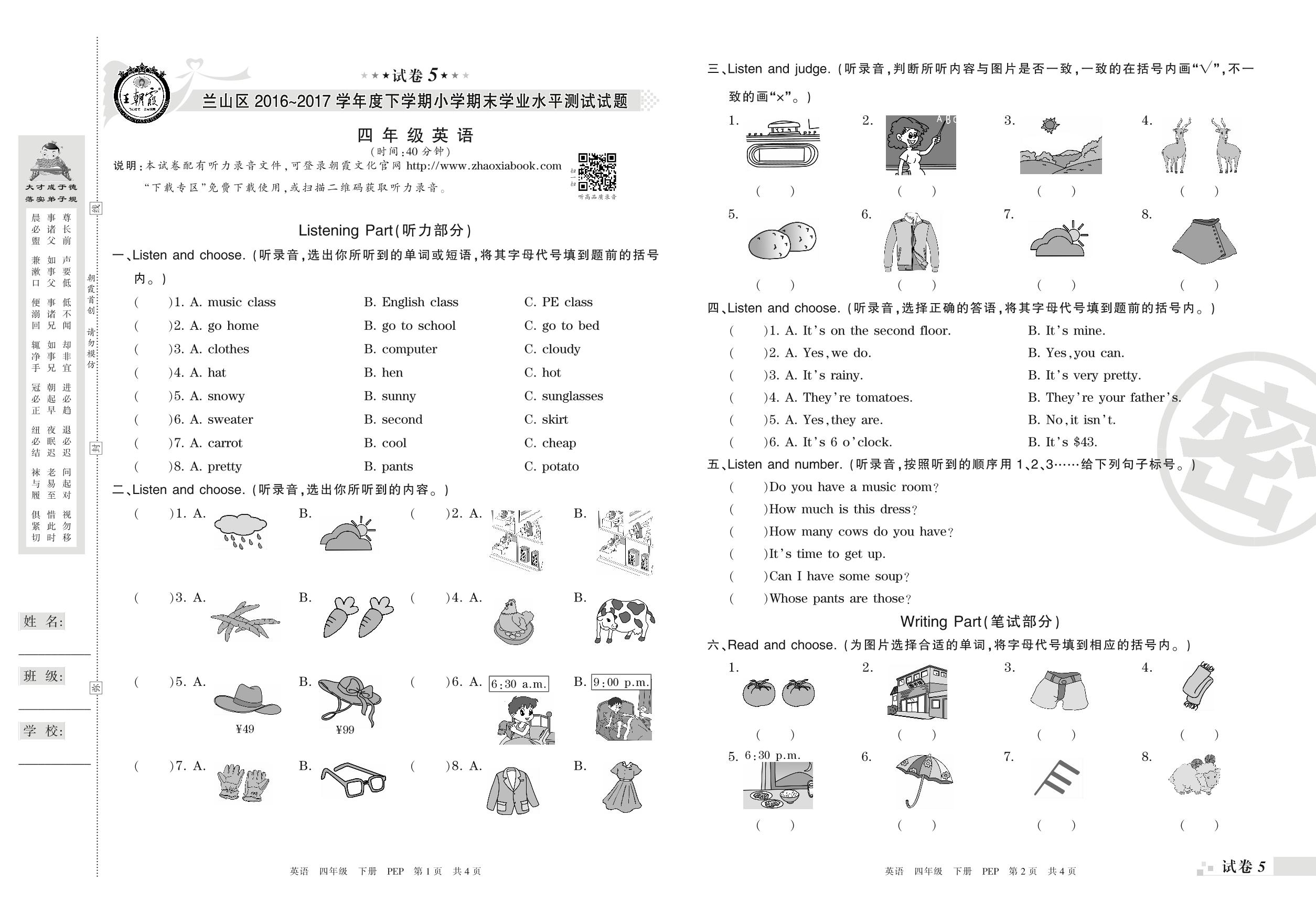 2016-2017学年第二学期临沂市兰山区四年级英语试卷(PEP版)【5】