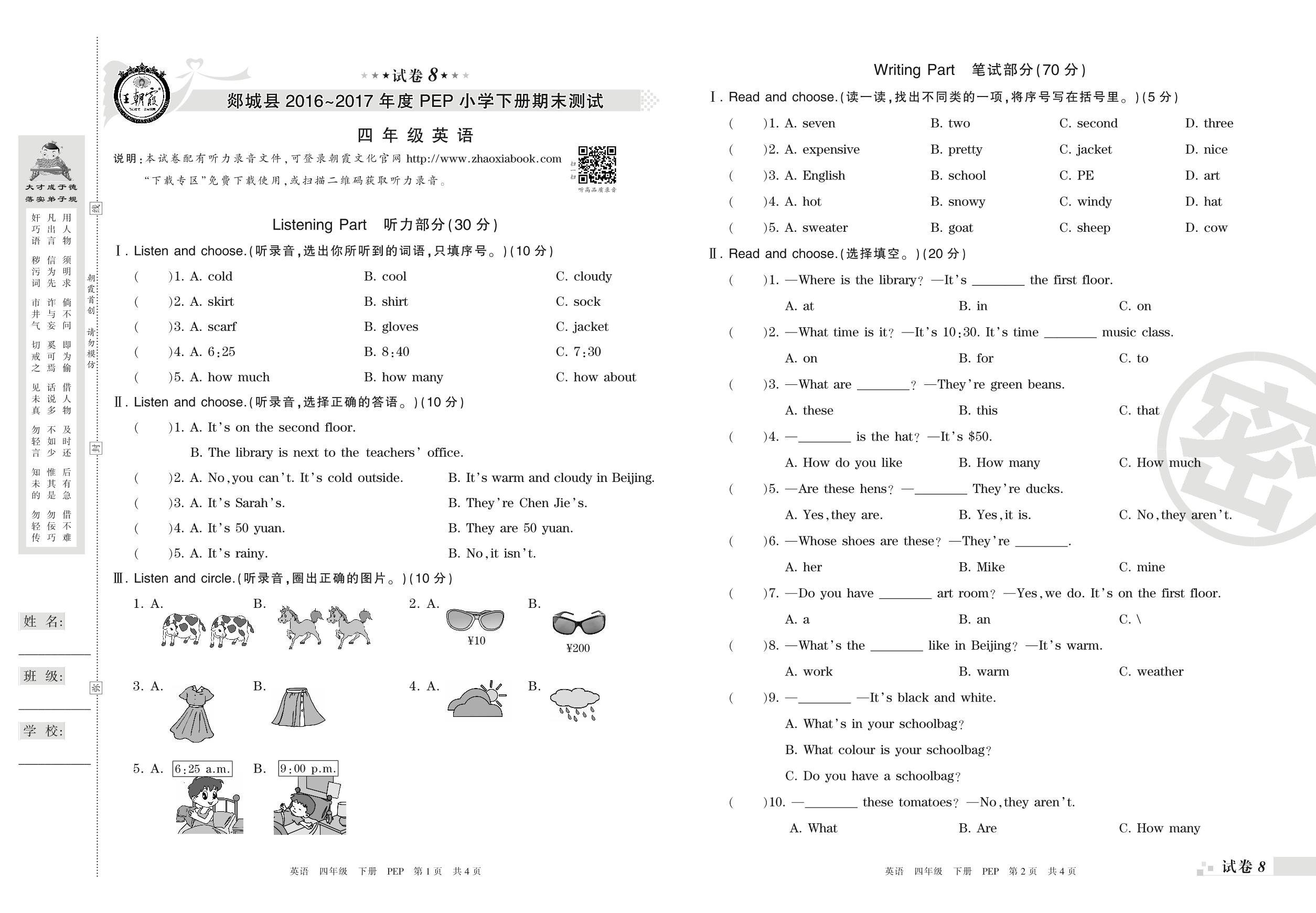 2016-2017学年第二学期临沂市郯城县四年级英语试卷(PEP版)【8】