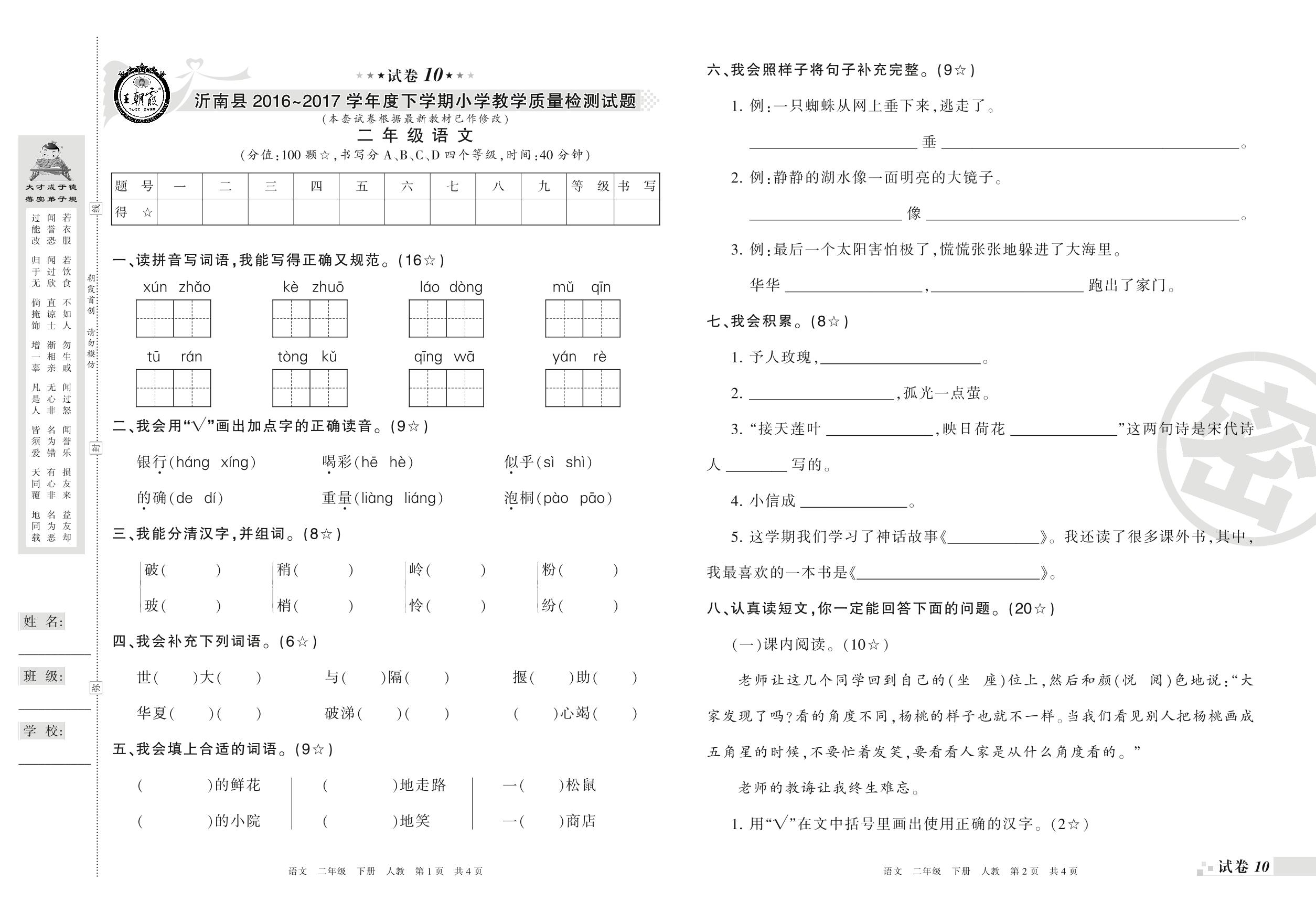 2016-2017学年第二学期临沂市沂南县二年级语文试卷(人教版)【10】