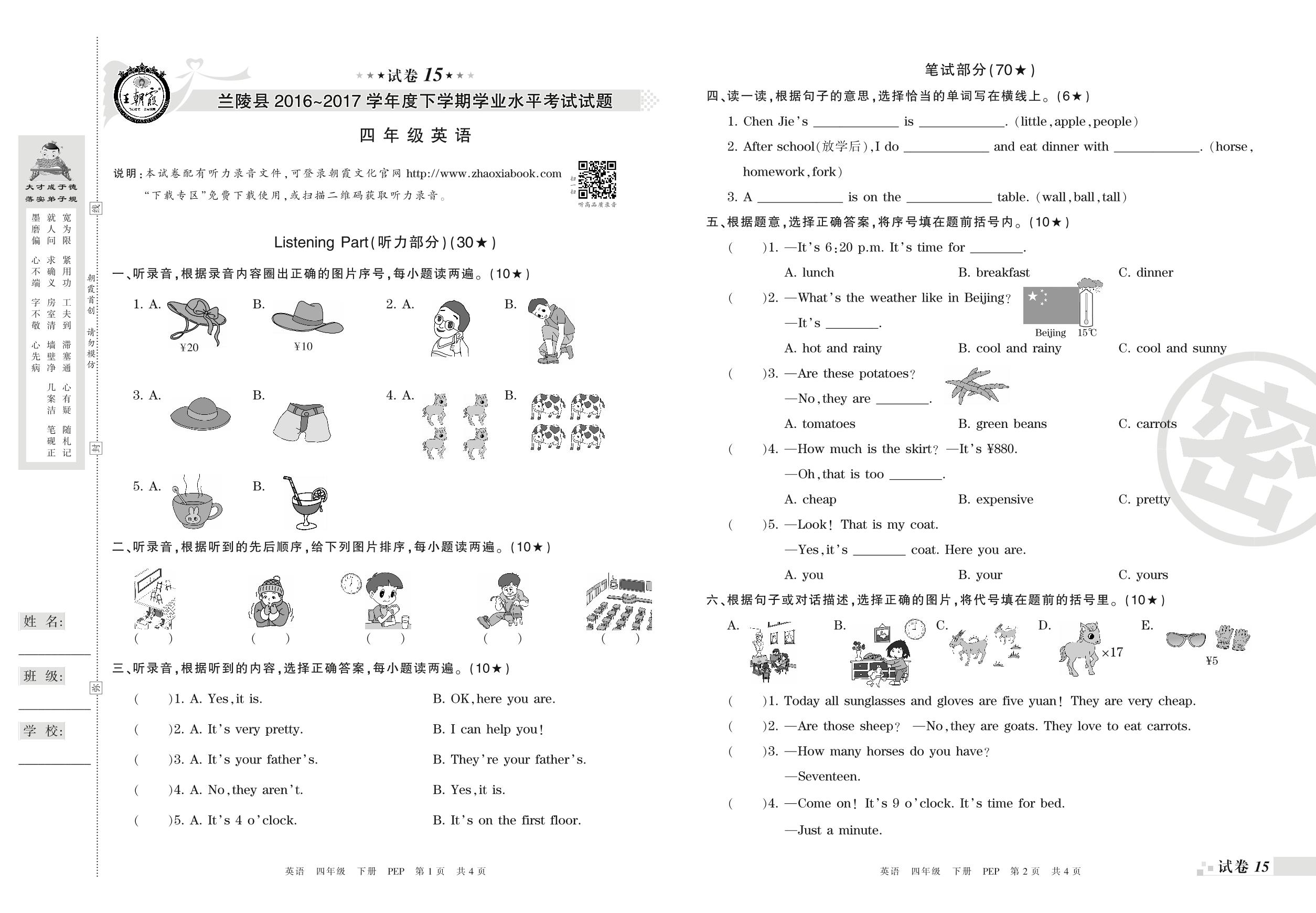 2016-2017学年第二学期临沂市兰陵县四年级英语试卷(PEP版)【15】