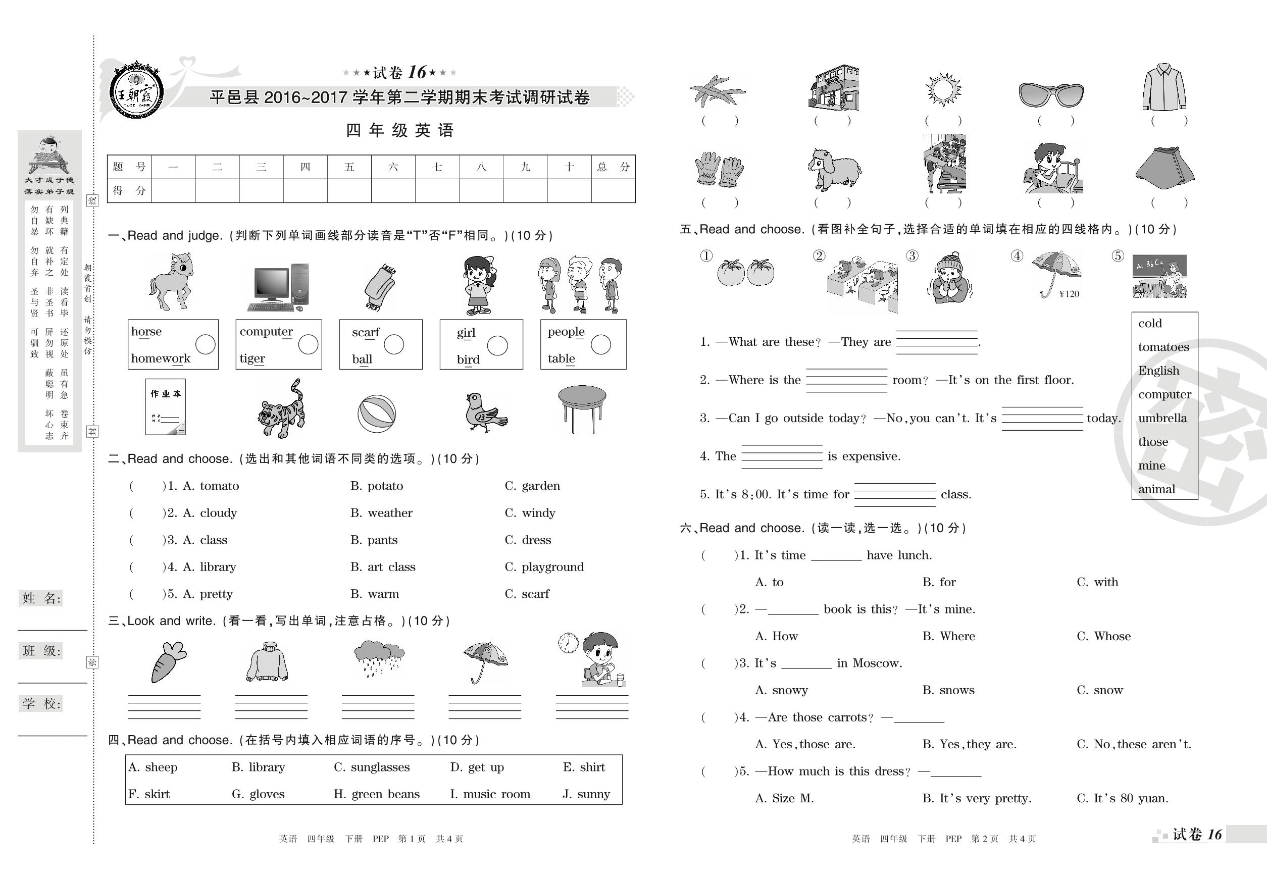 2016-2017学年第二学期临沂市平邑县四年级英语试卷(PEP版)【16】