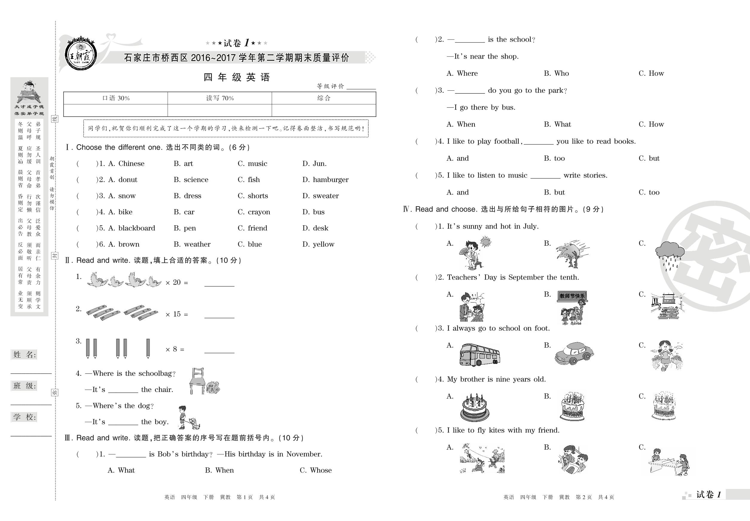 2016-2017学年第二学期石家庄市桥西区四年级英语试卷(冀教版)【1】