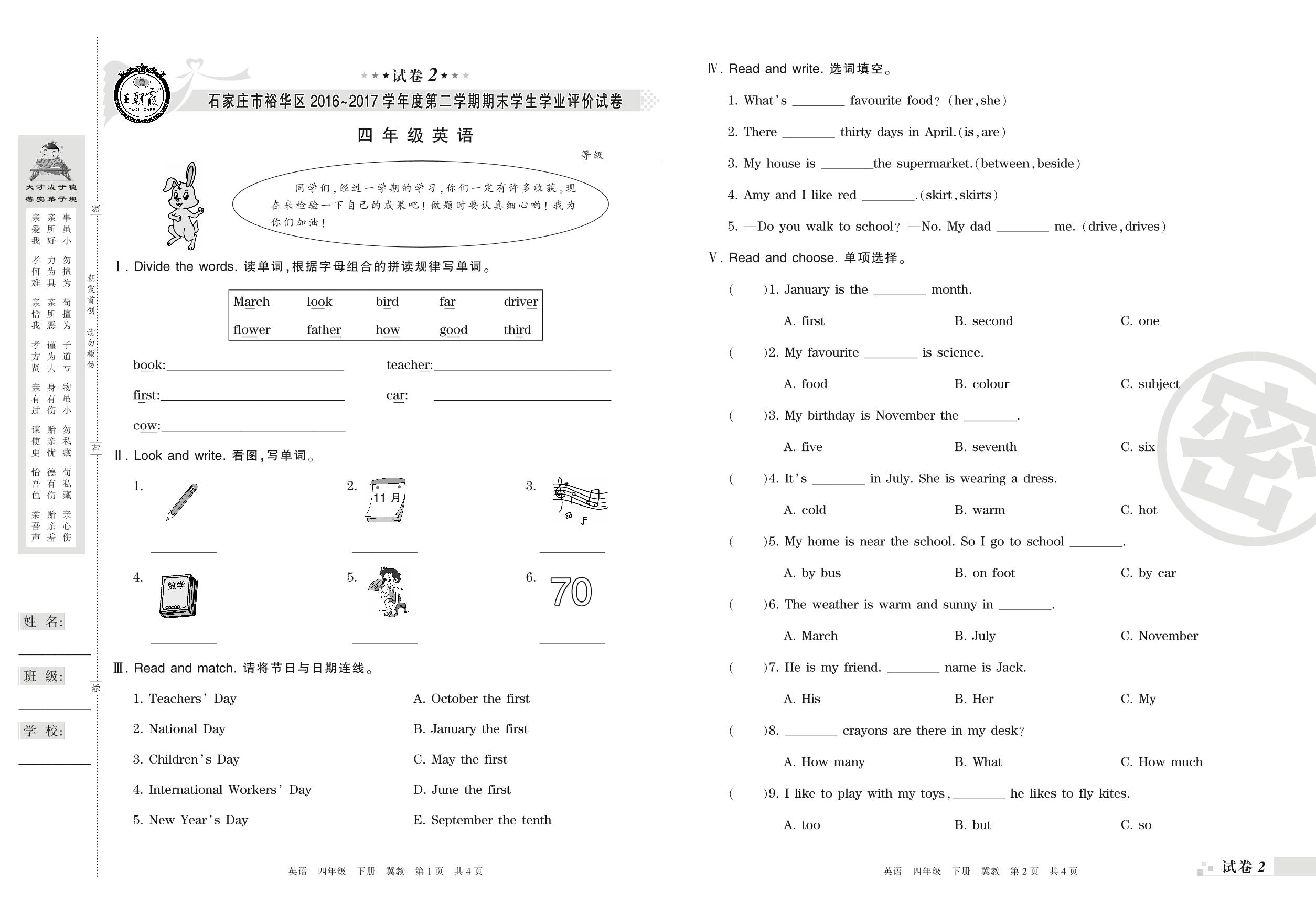 2016-2017学年第二学期石家庄市裕华区四年级英语试卷(冀教版)【2】