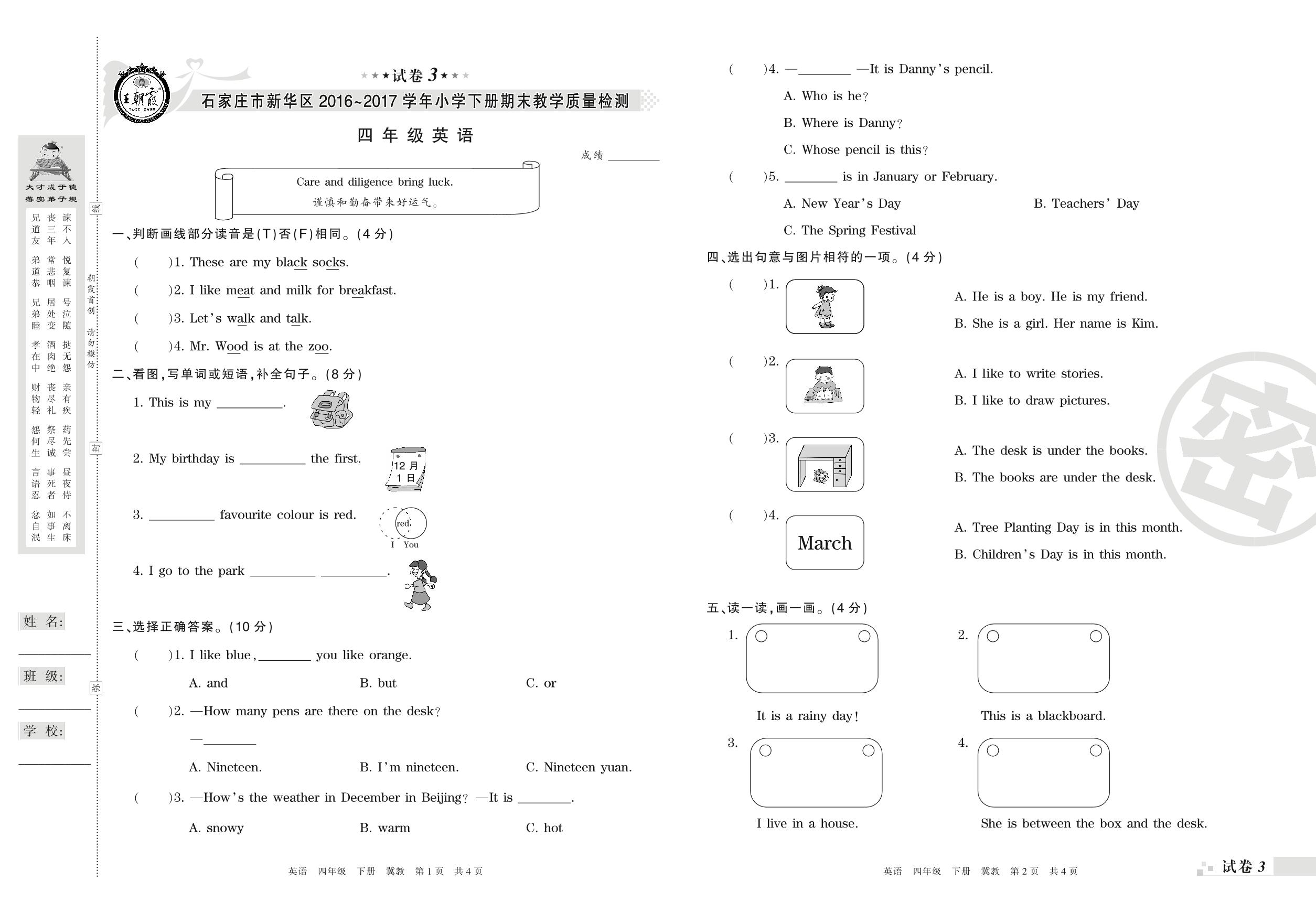 2016-2017学年第二学期石家庄市新华区四年级英语试卷(冀教版)【3】