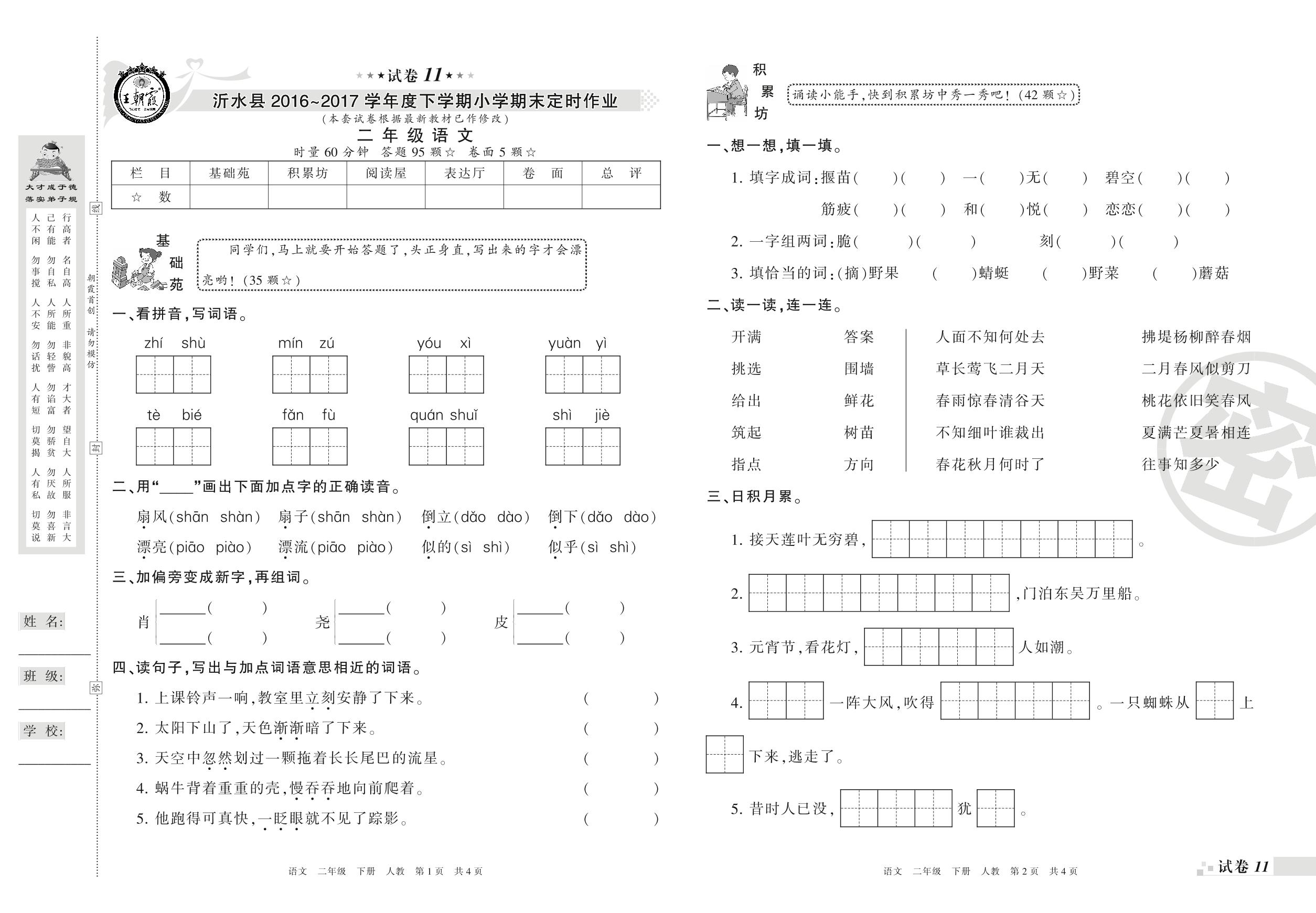 2016-2017学年第二学期临沂市沂水县二年级语文试卷(人教版)【11】