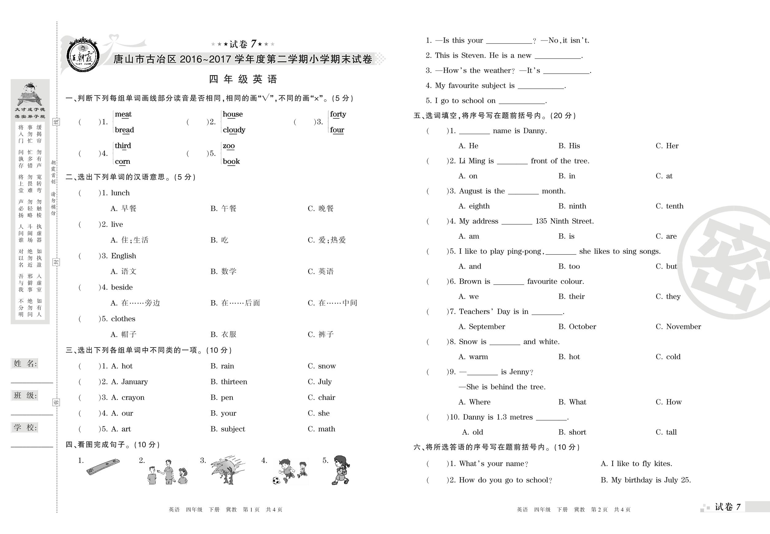 2016-2017学年第二学期唐山市古冶区四年级英语试卷(冀教版)【7】