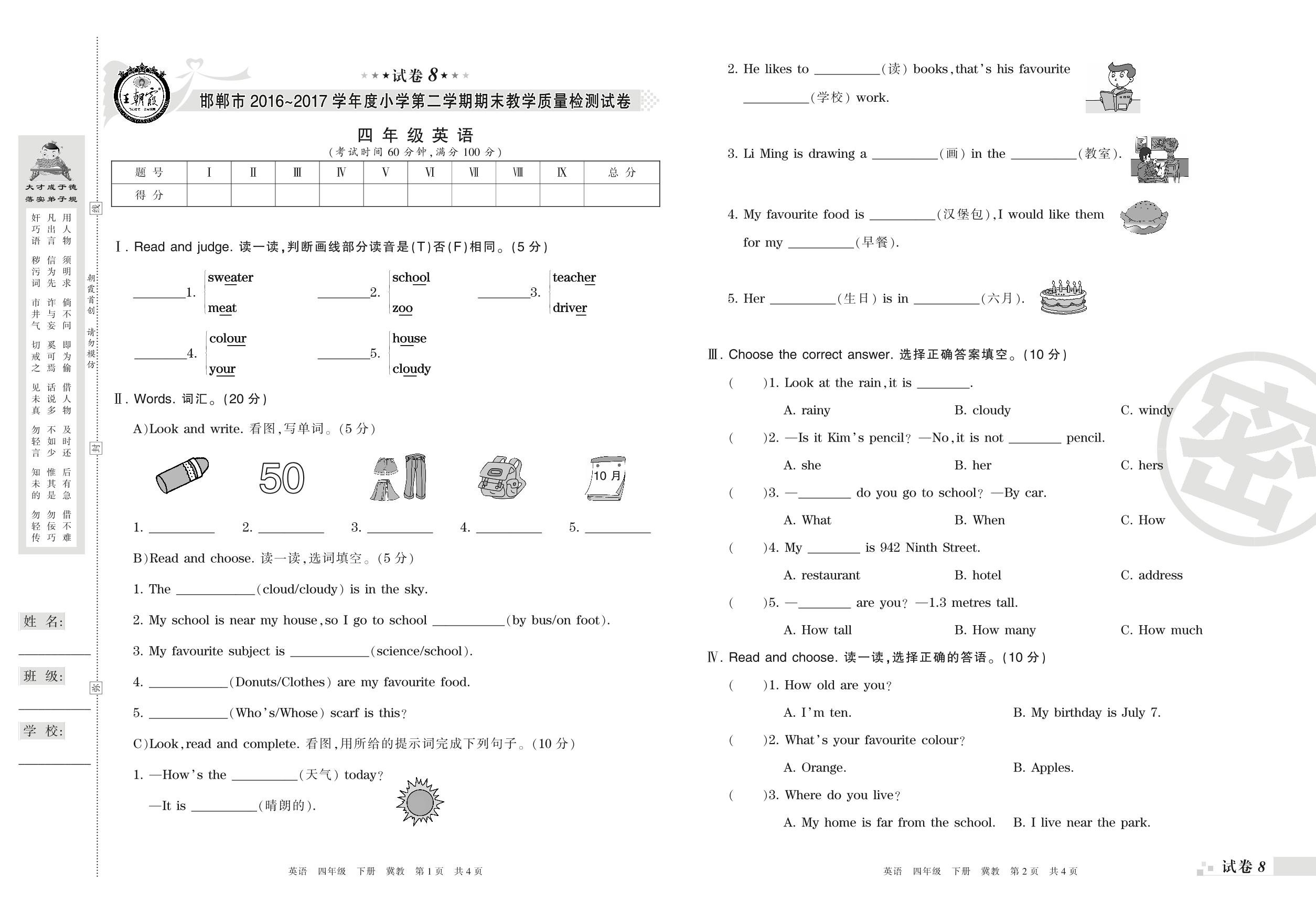 2016-2017学年第二学期邯郸市四年级英语试卷(冀教版)【8】