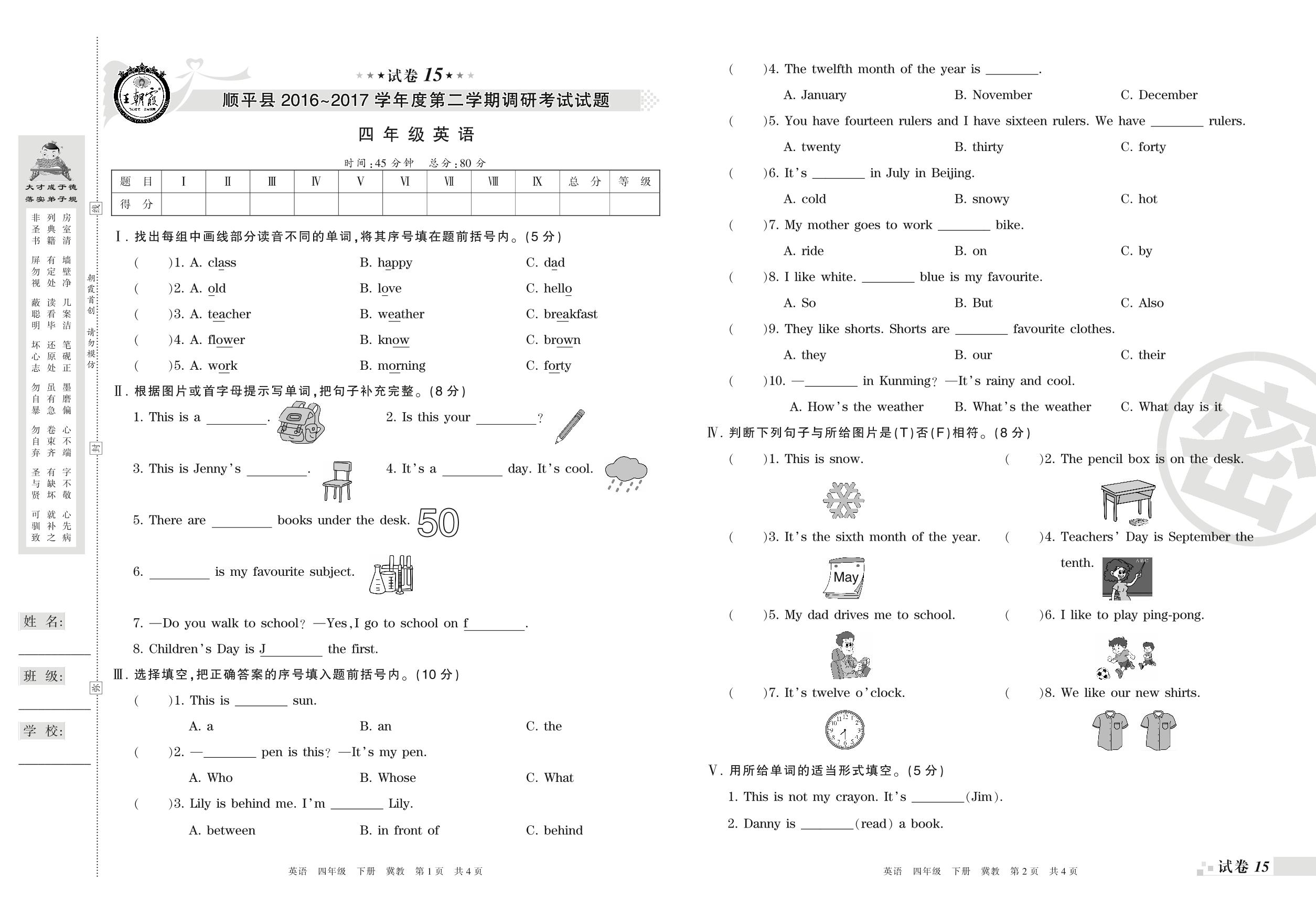 2016-2017学年第二学期保定市顺平县四年级英语试卷(冀教版)【15】