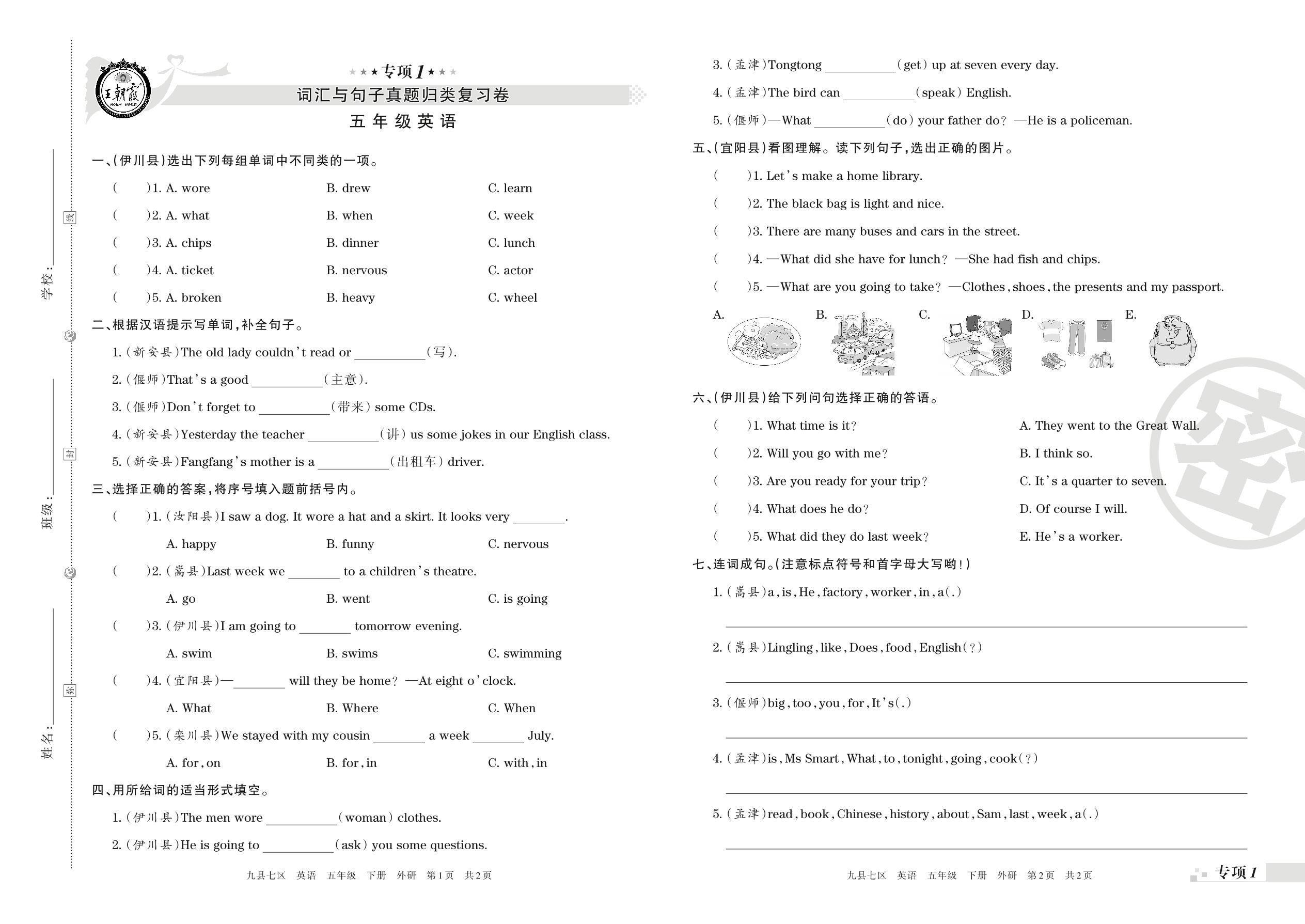 五年级英语外研版(三起始)下册专项卷