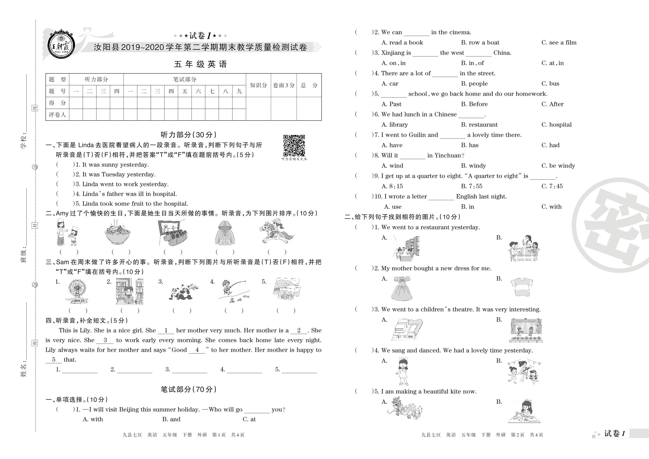2019-2020学年第二学期洛阳市汝阳县五年级英语试卷(外研版)【1】
