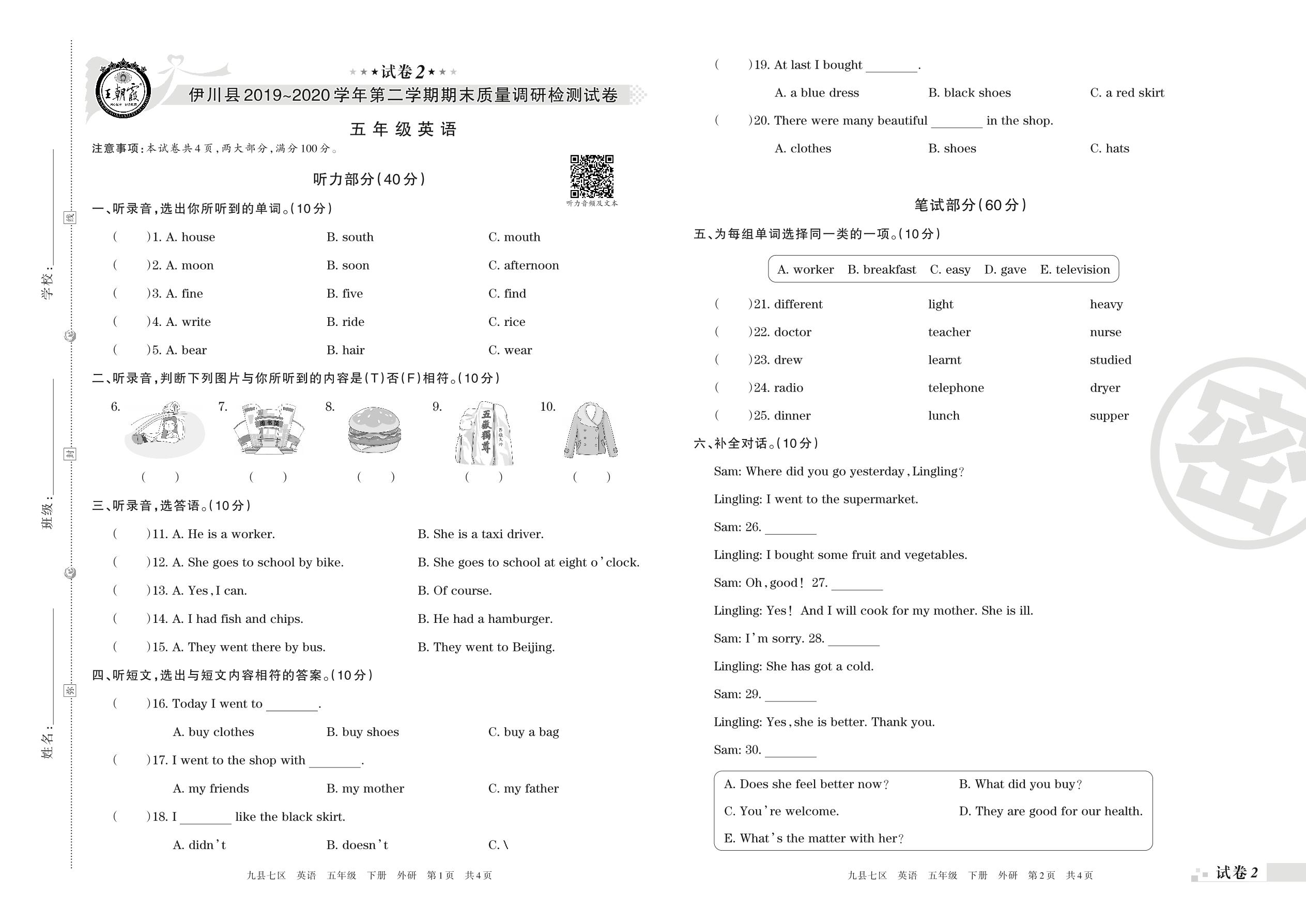 2019-2020学年第二学期洛阳市伊川县五年级英语试卷(外研版)【2】