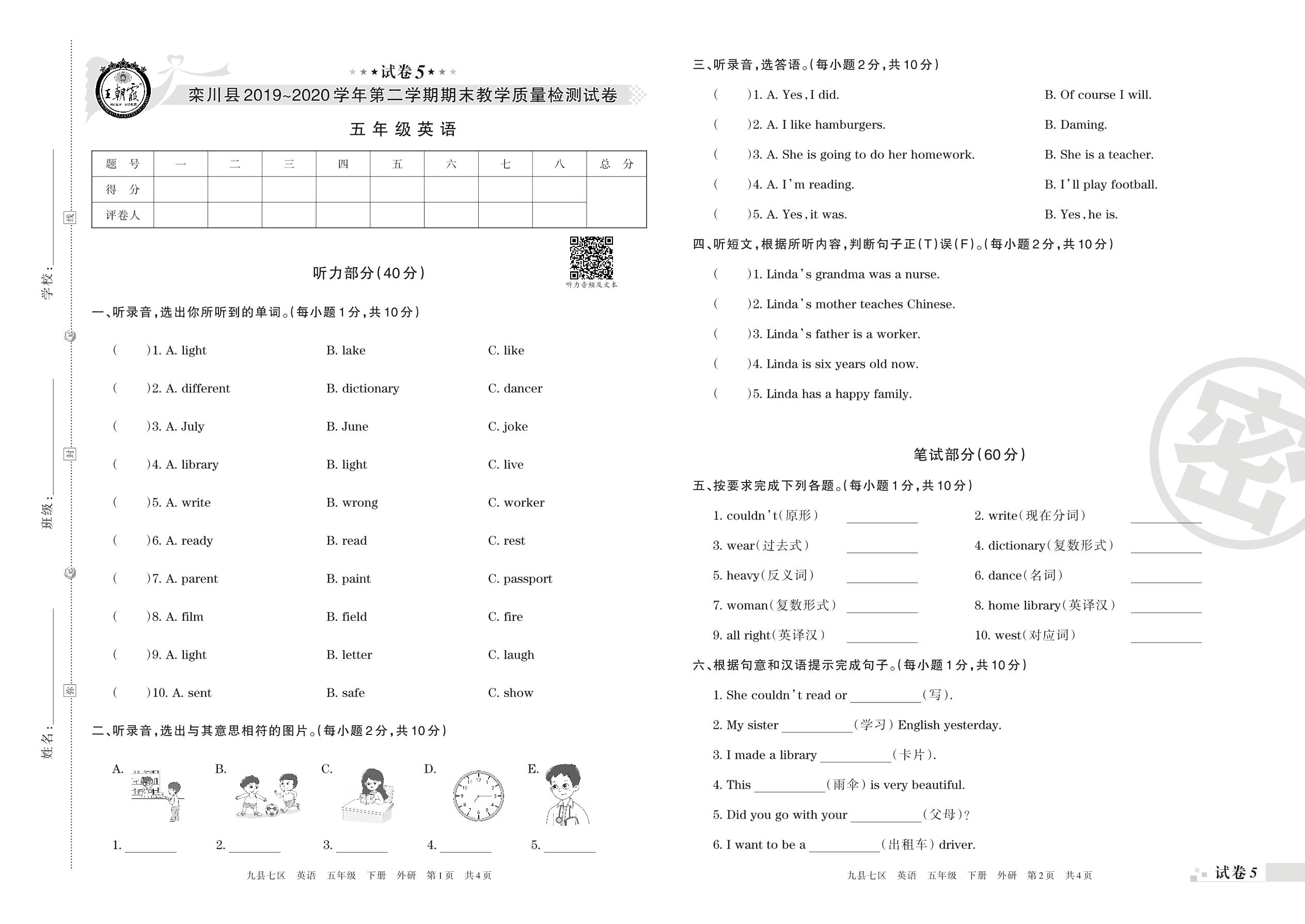 2019-2020学年第二学期洛阳市栾川县五年级英语试卷(外研版)【5】